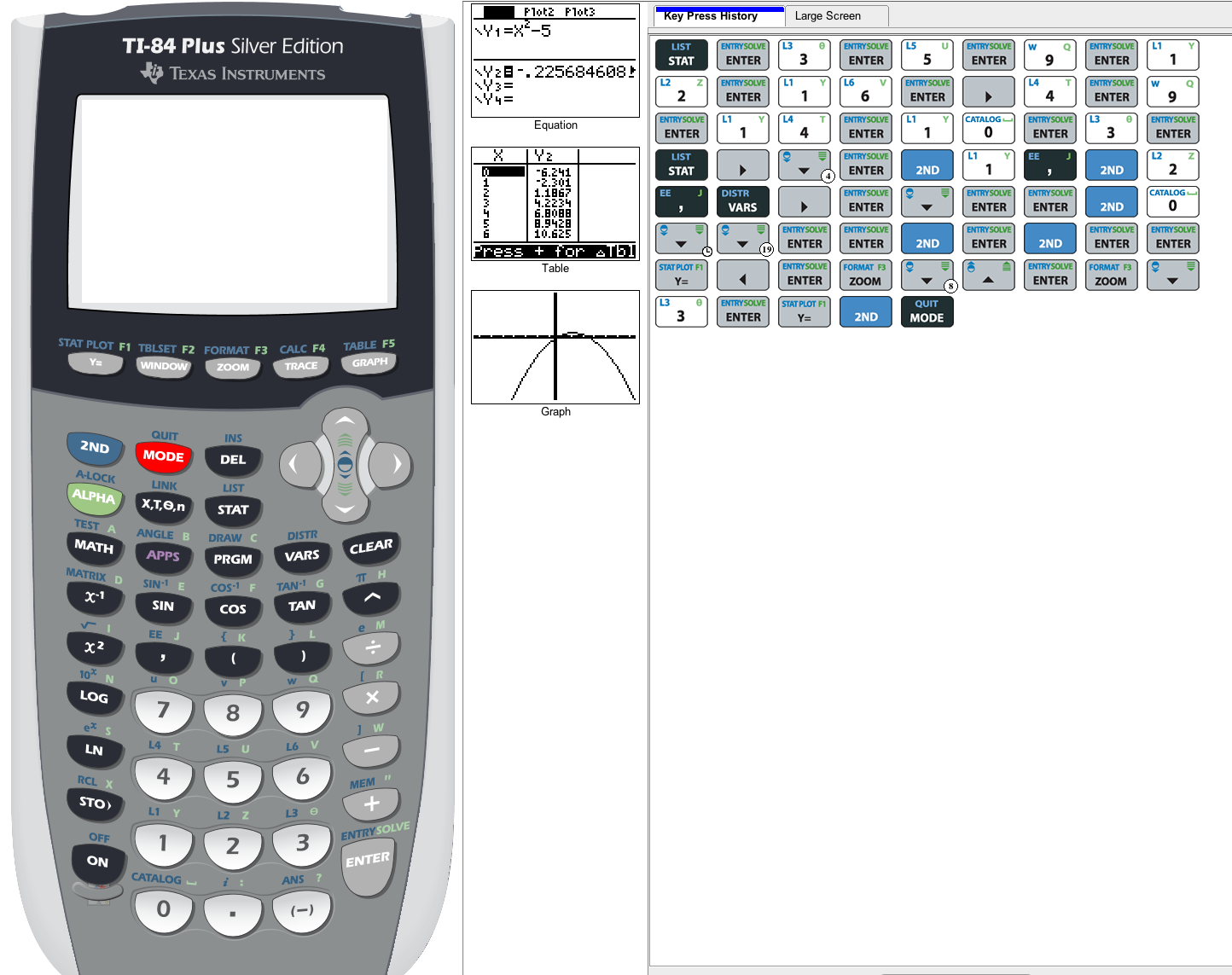 A third solution is to use the official TI-SmartView software from TI. This too is free…for 90 days. Its great advantages are that it displays several representations at once (multiple representations being one of our Big Ideas) and that it shows a history of key presses: