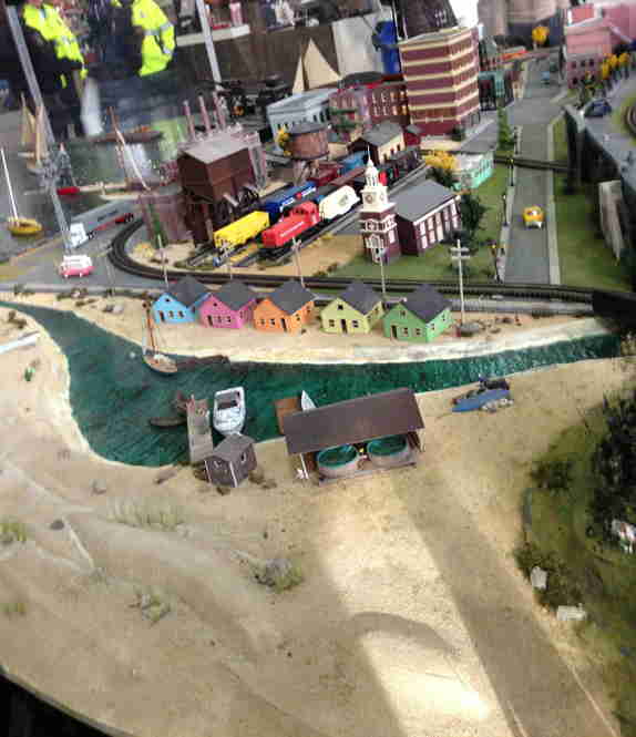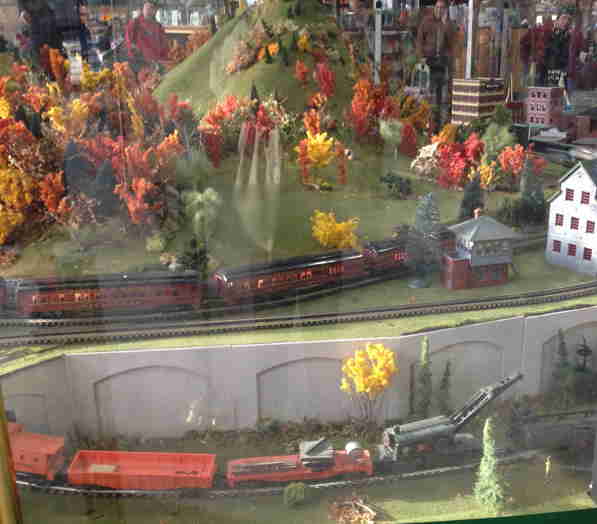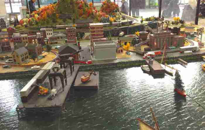 Fortunately I decided to take the T, so I didn’t have to figure out where to park in the vicinity of South Station, which is featuring a brand-new model railroad exhibit this winter. Actually, they’re toy trains, not model trains, but let’s not be too picky: just ignore the middle rail that you see in the tracks in the four photos below. The exhibit features some well-done scenery and structures — I particularly liked the harbor scene, the fall foliage, and the urban buildings — along with trains that worked much of the time. (There were only four derailments during my short visit.)