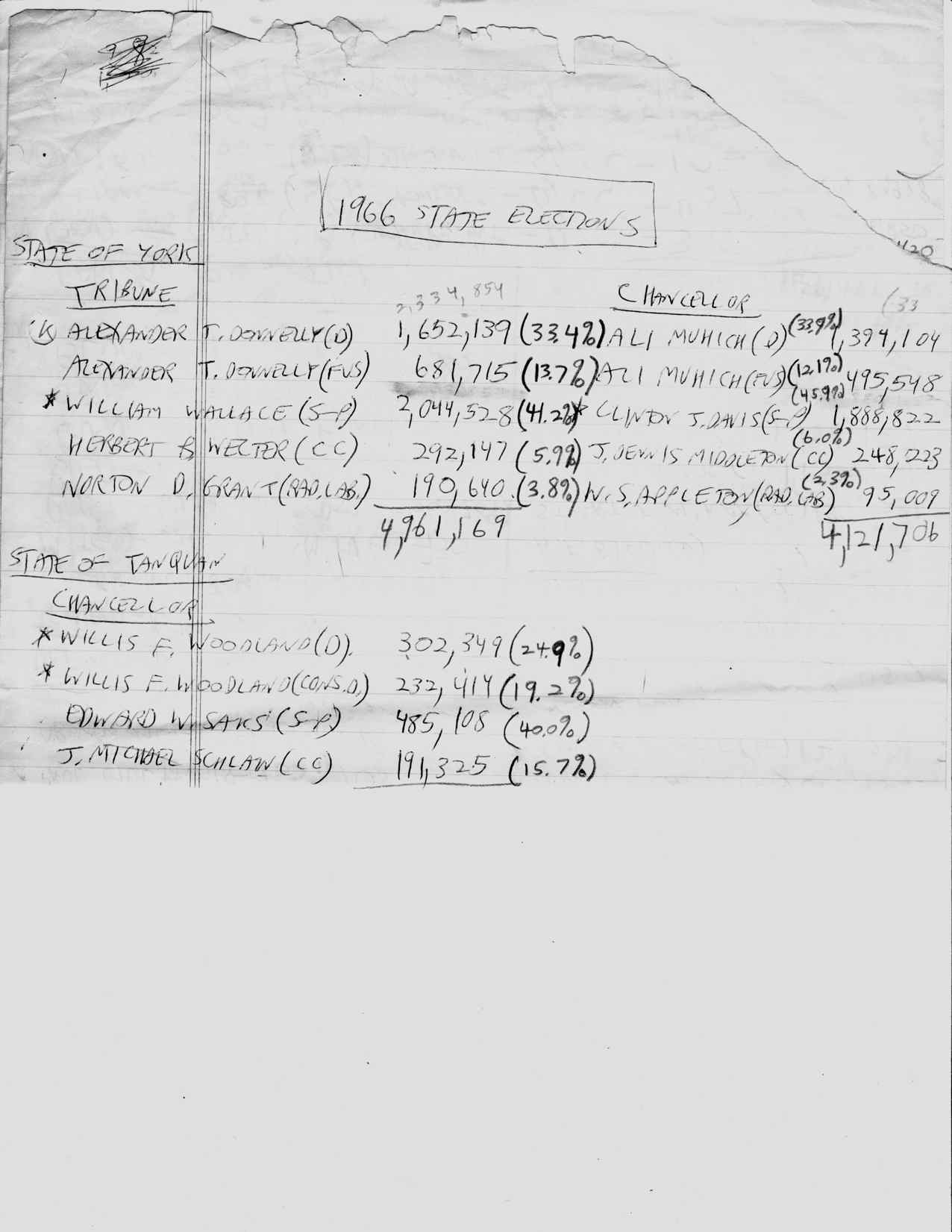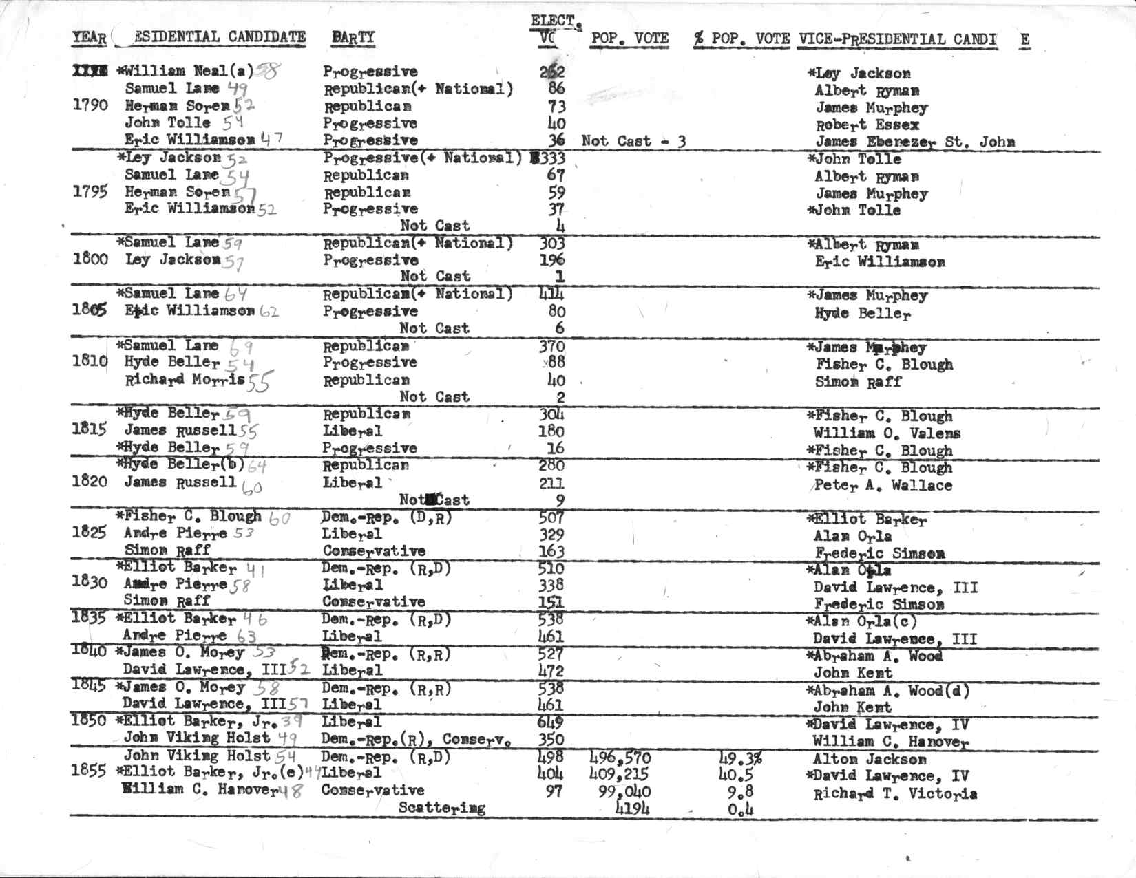 Then we have election statistics, page after page of them. Here’s a page of some early presidential results, typed on my trusty Royal portable typewriter (which I started using at age 12 as my handwriting was so bad). Note that I was too closely basing my ideas on U.S. history, even down to the use of electoral votes and the relatively late introduction of the popular vote: