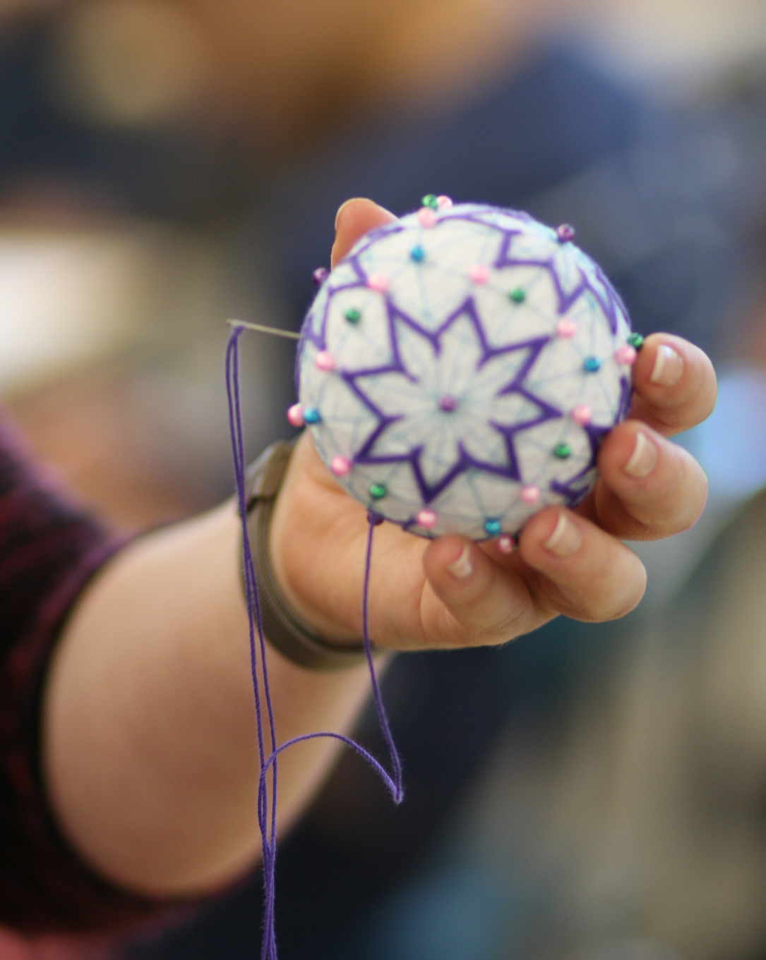 We traditionally cap off Honors Geometry by ending the course with a brief exploration of non-Euclidean geometries. In recent years we have focused on geometry on the surface of a sphere; we ask freshmen to pretend that they are living on such a surface rather than on the flat Earth that they had been assuming all year up to that point. This year my co-teacher, who is much craftier than I, developed a hands-on unit in which students created Japanese temari balls and used them as a model for finding shortest paths, parallel “lines” (which don’t exist on the surface of a sphere), sums of angles in triangles, and other surprising results. With this beautiful craft, students had a hands-on experience that opened a gateway to non-Euclidean geometry.