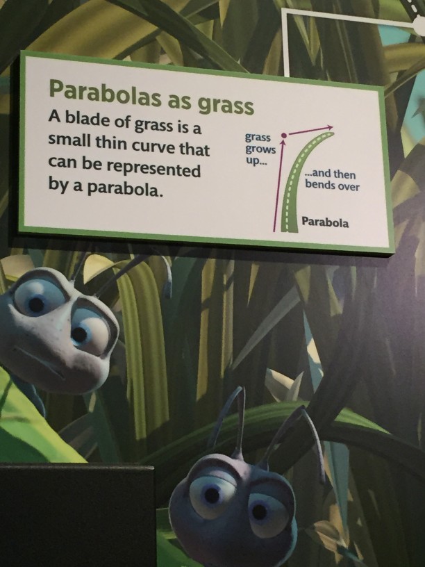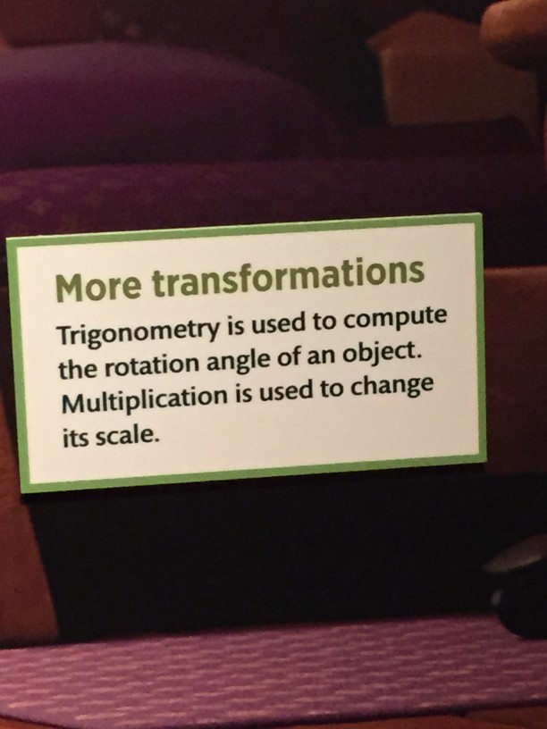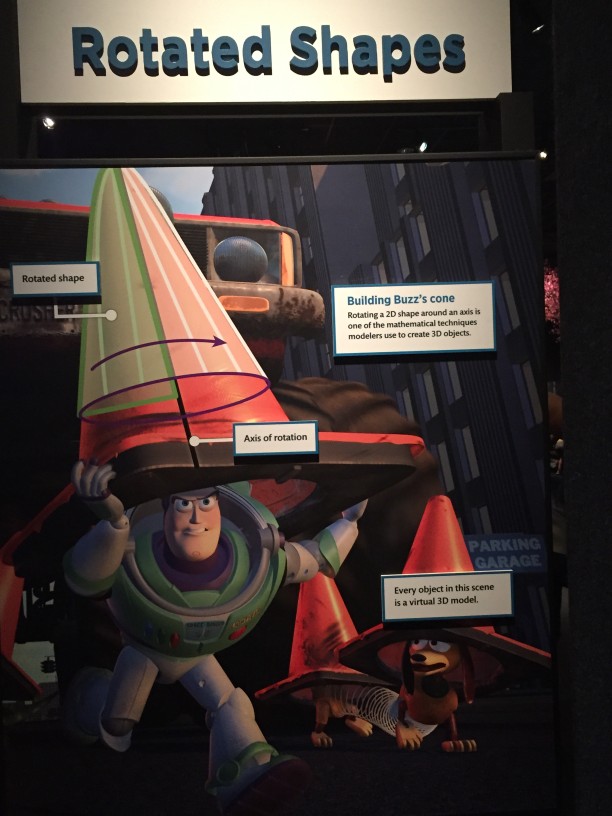The Museum of Science in Boston is currently hosting an interactive exhibit called “The Science behind Pixar.” This science turns out to be primarily a combination of transformations and mathematical models. Animation, of course, used to be the result of thousands of cels painstakingly drawn by hand by dozens (hundreds?) of artists. But today the use of computer technology lets it be far more elaborate and realistic. Surprisingly, the museum allows photography for this exhibit, so here are some of my photos along with some of my comments relating them to math teaching.
