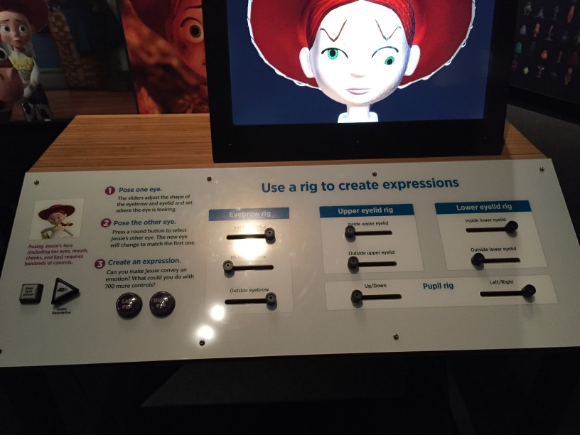 The question is how to use these transformations to vary a set of parameters and then to see the effects of doing so in real time. The Pixar exhibit includes a wide variety of workstations with physical sliders that viewers can use to control transformations. For example: