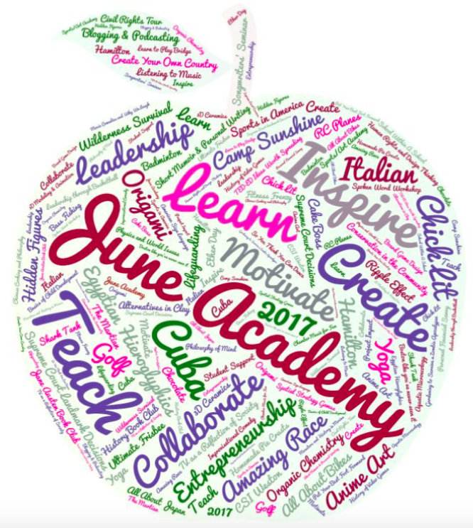 You say that’s wrong? Of course it’s wrong. So Weston finally decided to do something about it. We cut two weeks off the curriculum of each course (a daring move in a suburban school that buys into heavy academic competition), moved finals two weeks earlier, and devoted the last two weeks to a very wide area of intensive mini-courses with no grades, no homework, and no tests. Most classes met for three hours a day for five days, though a few met for more hours or more days. Peruse the word cloud above for an idea of the amazing variety of courses that were offered. We were encouraged to teach topics outside of our standard subject area, as you can readily conclude from the list of course titles.