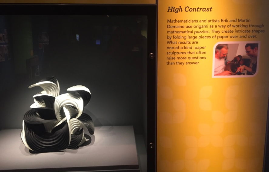 My capsule summary is that it is generally high in quality but low in quantity. Yes, I agree that quality is more important, so it will be just fine for you if you’re visiting Boston’s Museum of Science anyway. But perhaps it will be disappointing if you make a special trip. The exhibit features four mathematical topics: