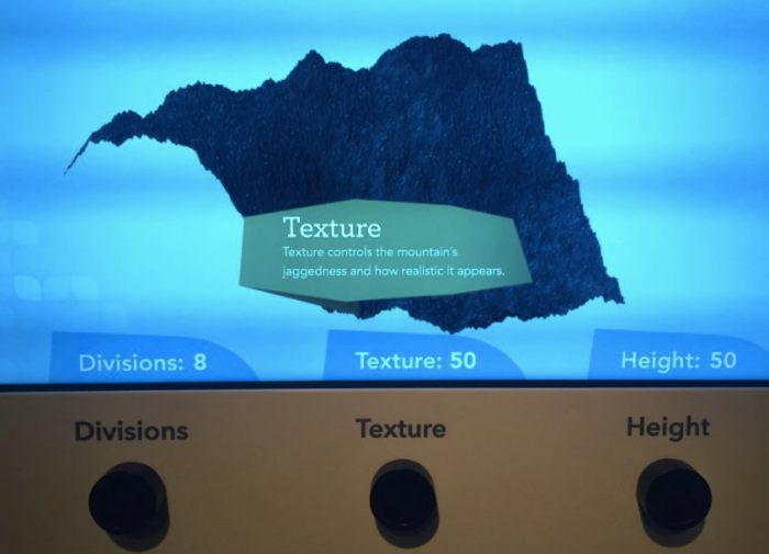Similarly, there is another interactive display that lets the visitor tweak a different set of three parameters and thereby generate remarkably realistic fractal landscapes in real time. Kudos for this one too: