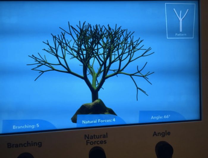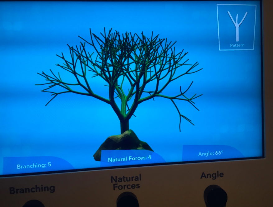 On the other hand, we have a lovely interactive display that lets the visitor tweak three parameters and thereby generate remarkably realistic fractal trees in real time. Kudos for this one: