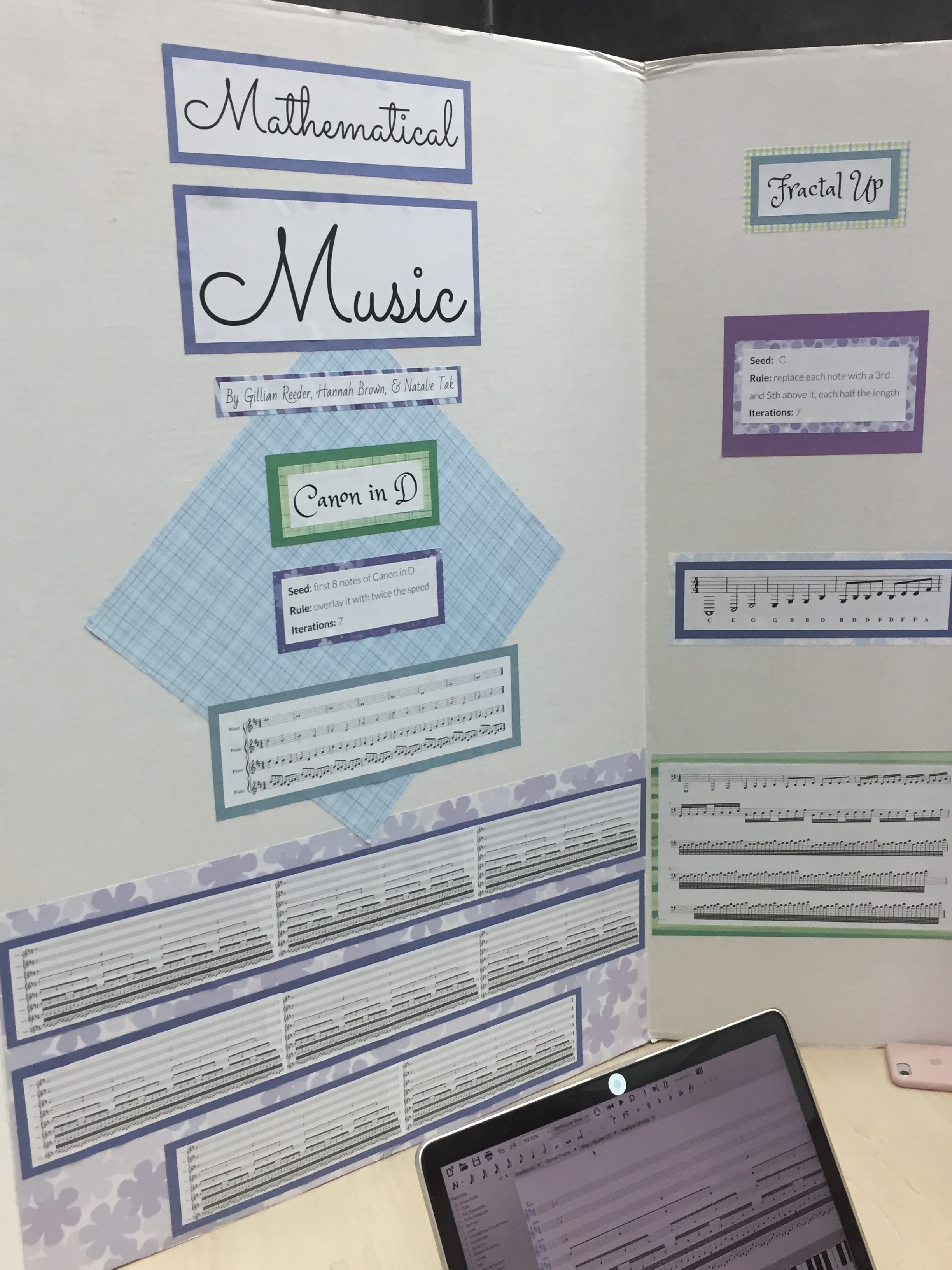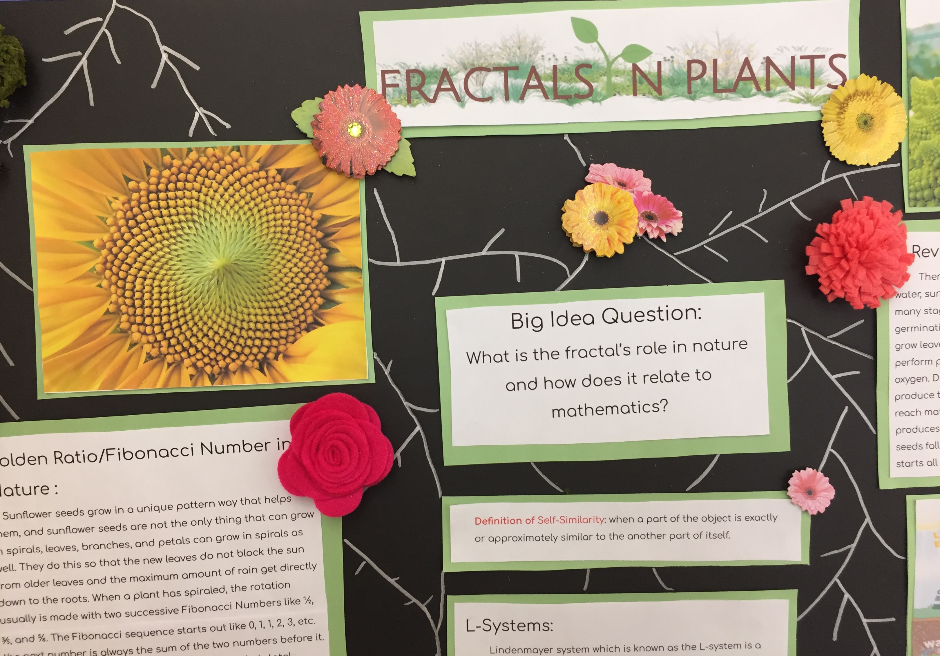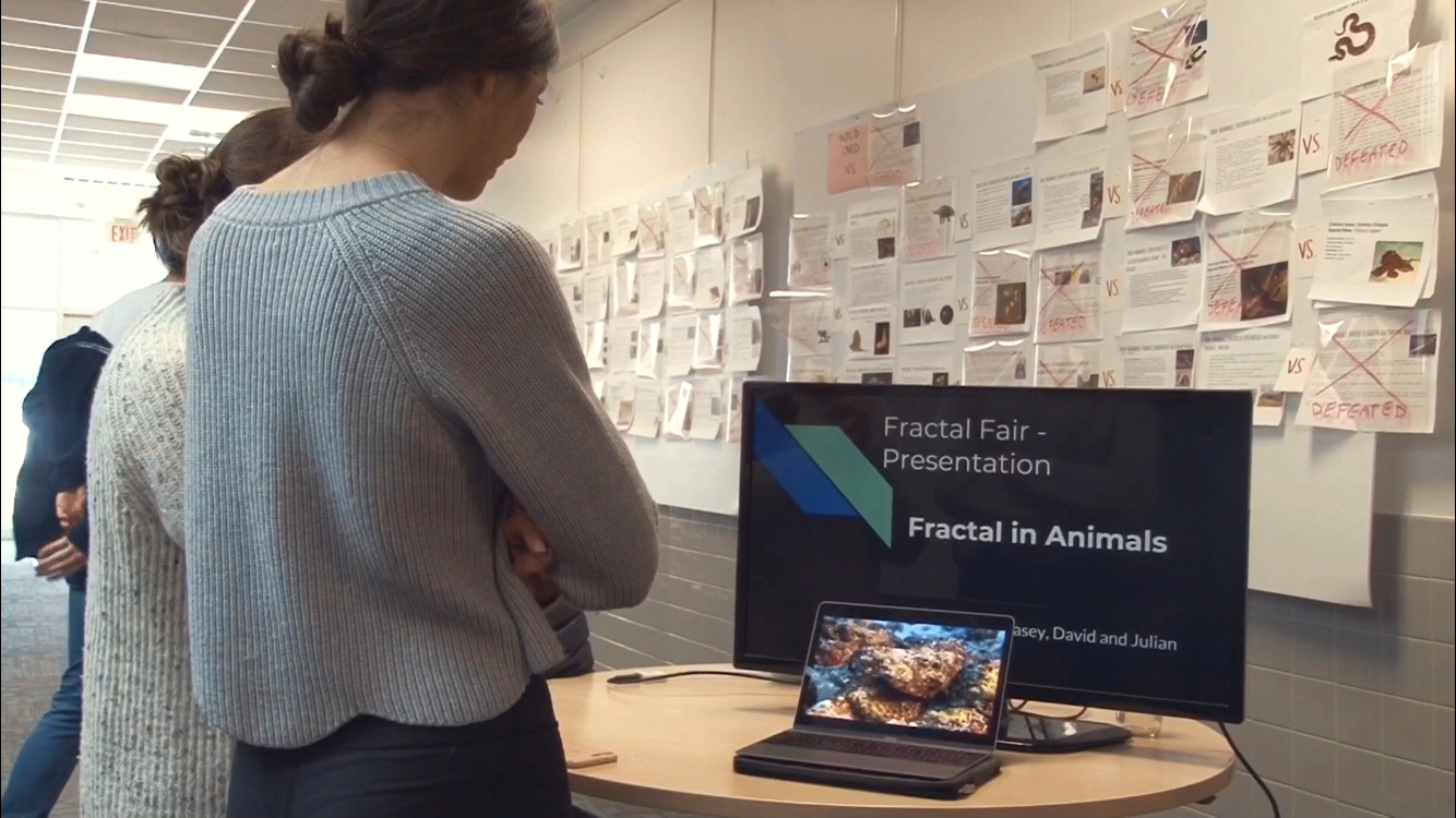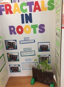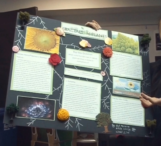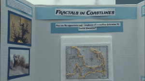 The eventual compromise was to have five mini fractal fairs, one in each Honors Precalculus section, so no student had to miss a class in another subject. Everything went well in the end, even though we were sorely lacking guests — such as teachers from other departments, community members, and (especially) parents of the students presenting. You can get some idea of the range of topics by exploring the selection of photos scattered through this post.