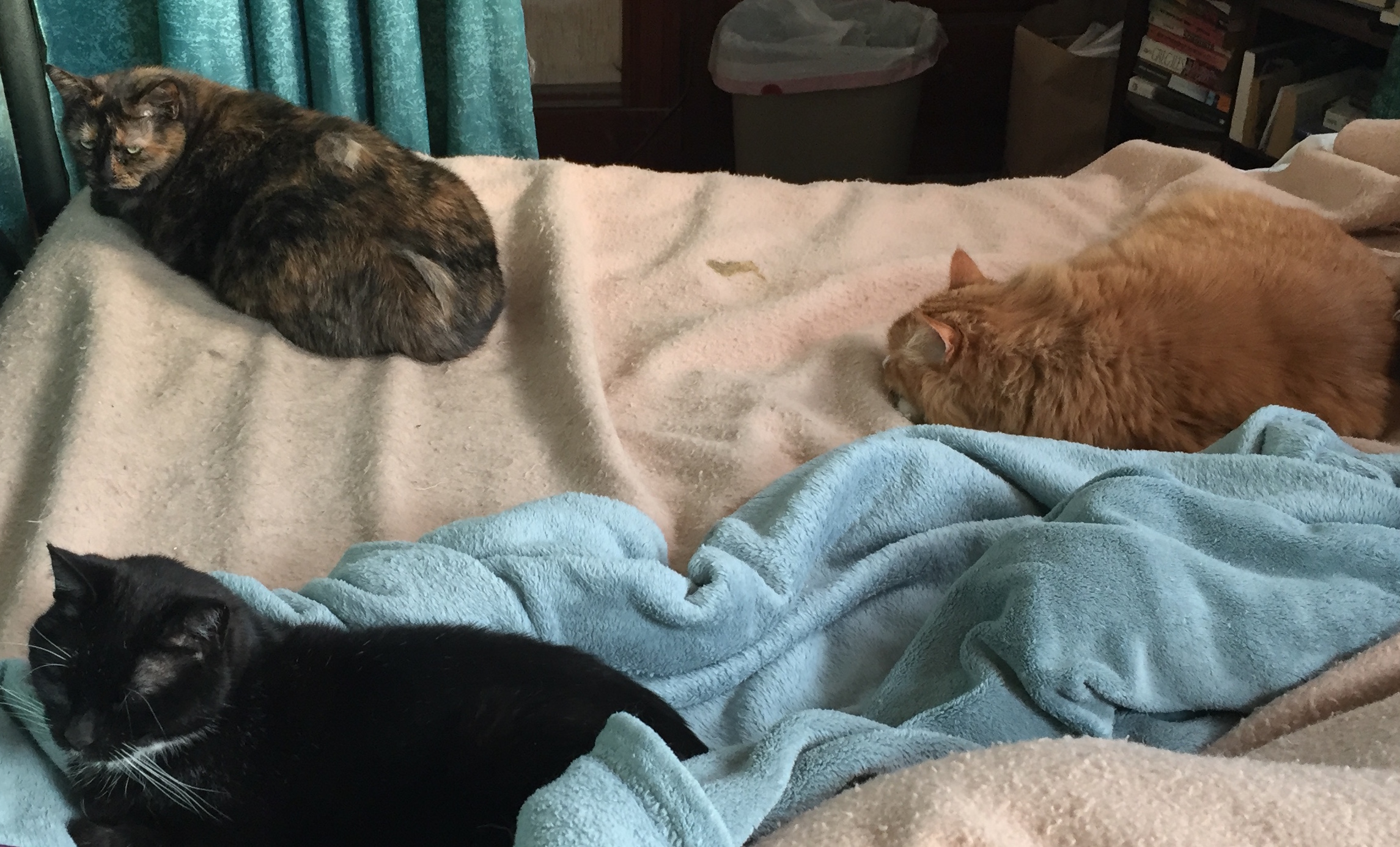 Three of the cats, doing their best to sit at the vertices of an equilateral triangle (even though William isn’t paying attention and Vincent is messing up the covers):
