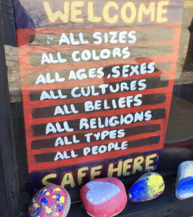 Not much to say about fine dining in Winthrop, but we did have an excellent dinner the first night right there at the Winthrop Arms, and an excellent lunch the second day at the Blackstrap BBQ, owned and run by two refugees from Cambridge’s famous East Coast Grill. In addition to having great food and service, I couldn’t resist taking a picture of the oh-so-Cantabrigian sign in the front window. We did indeed feel welcome: