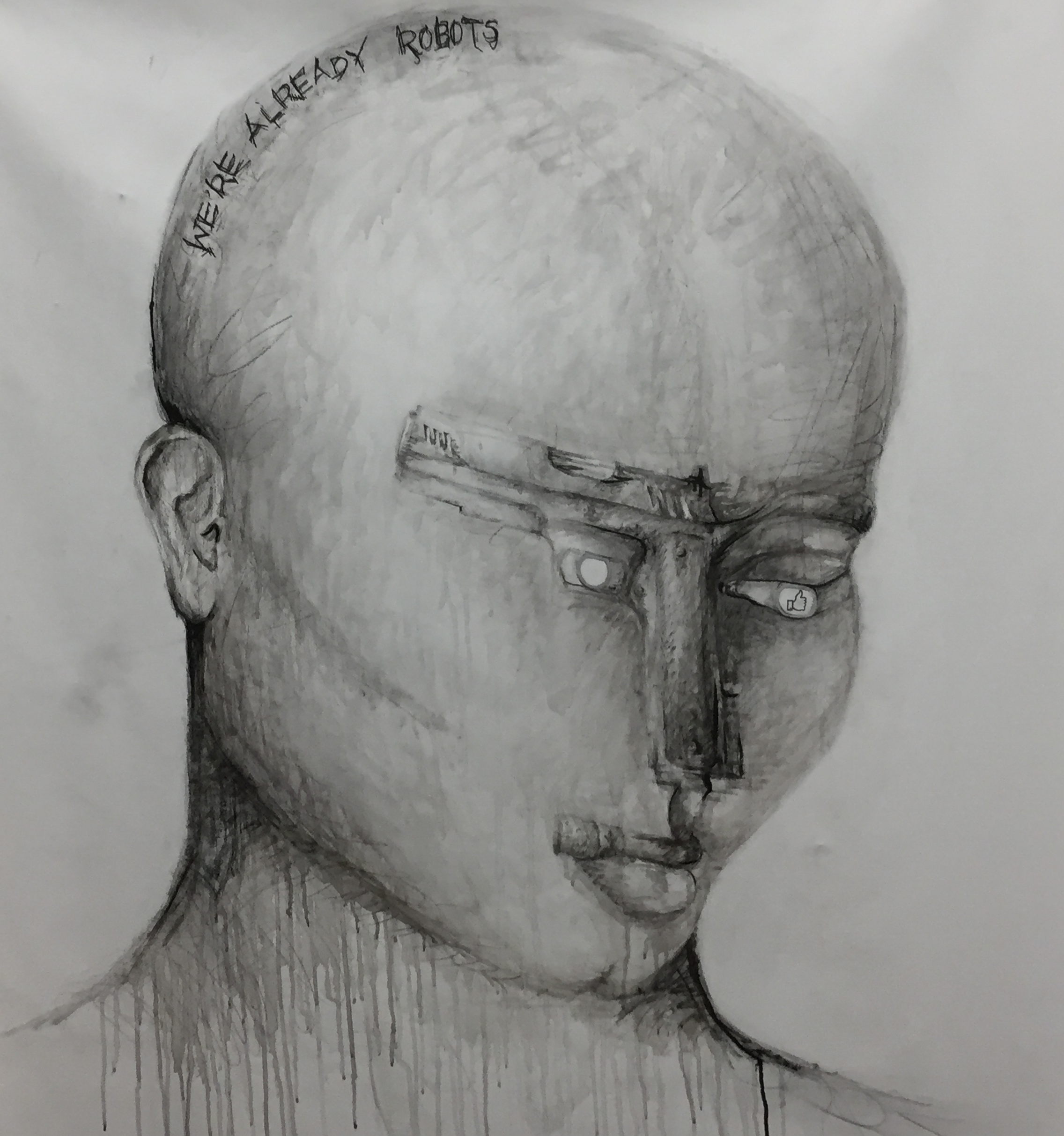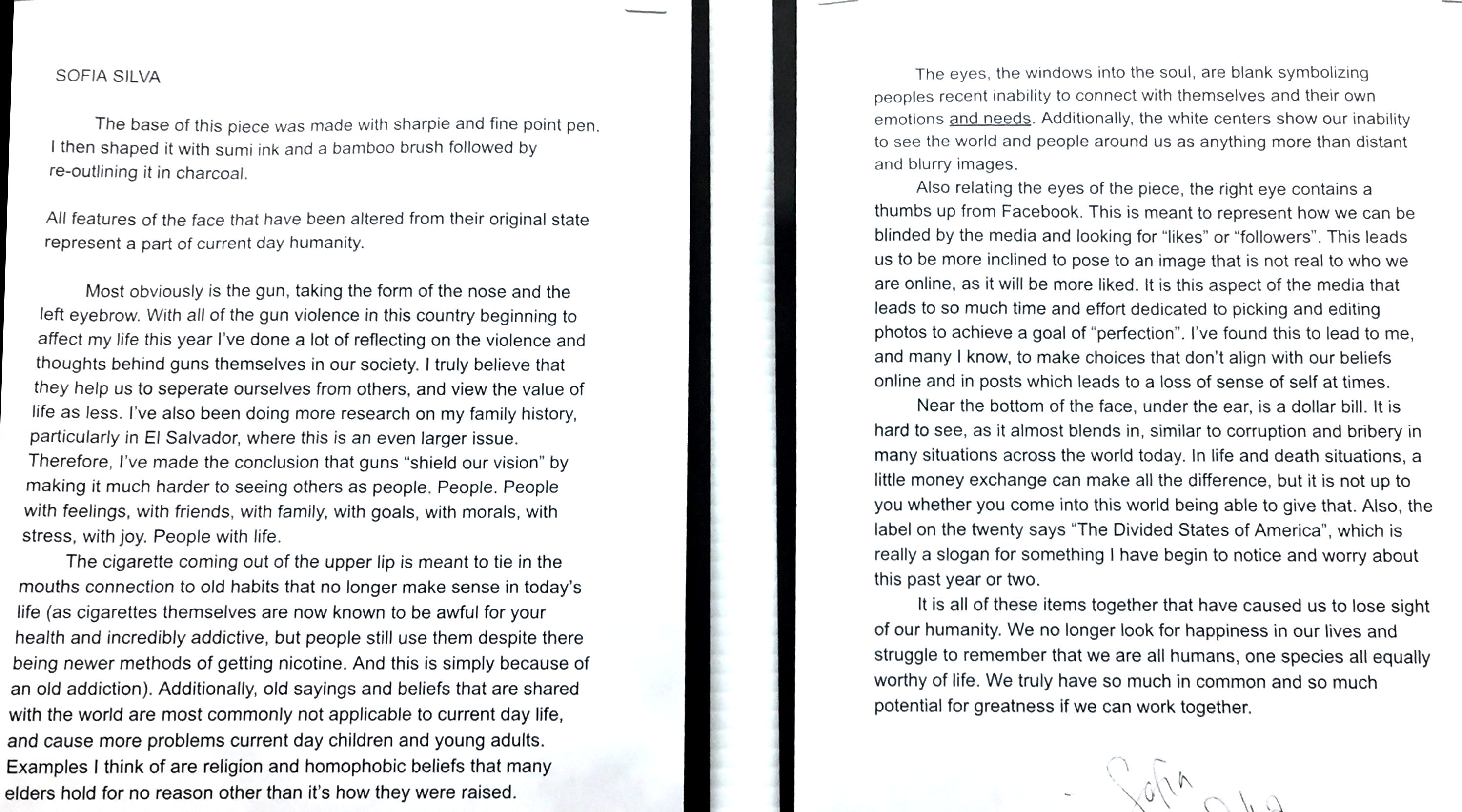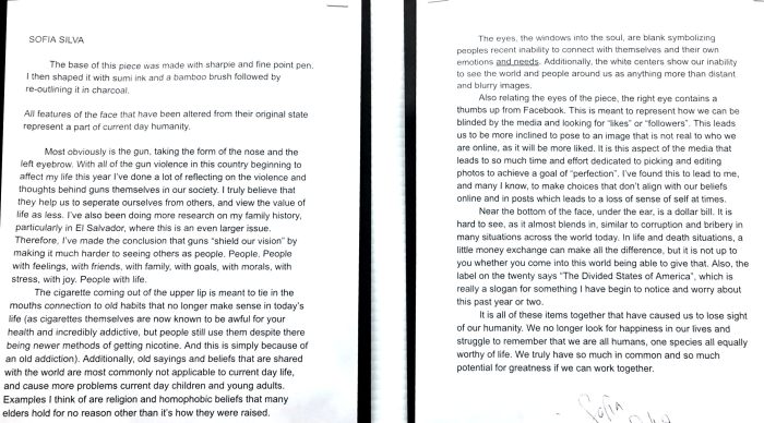 You have one more week to see the powerful art show by Weston K–12 students. (If you click on that link, you may need to wait a minute for all the images to render.) I particularly want to single out the black-and-white drawing by ninth-grader Sofia Silva, shown below with her permission. Although art is supposed to be self-explanatory, you should definitely read Sofia’s powerful artist’s statement along with studying the drawing:
