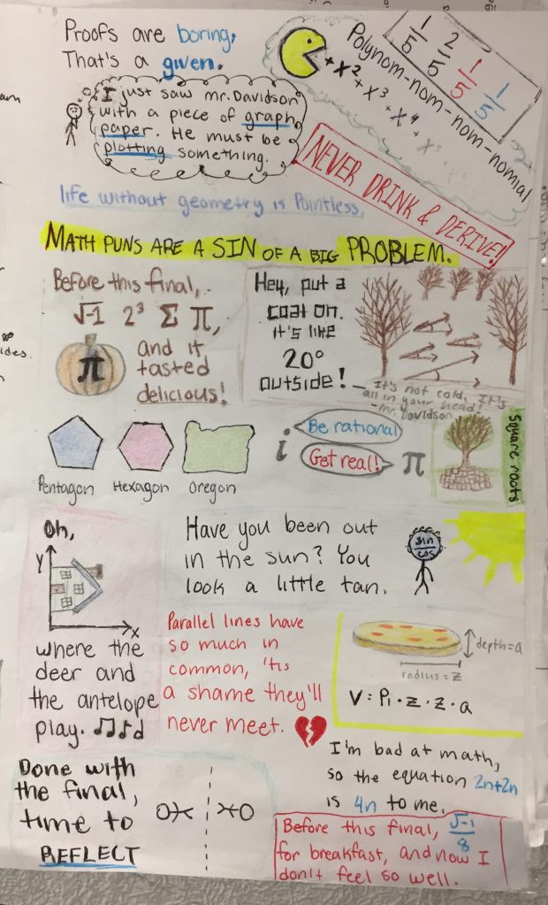 Do you smile when taking or grading final exams? Not likely. Those are two different activities, of course: when you take a final, at least it’s over in two hours, but grading dozens of them can get… well… tedious at times. This is especially true when we grade as a department, as we do in the Math Department at Weston. To maximize consistency and boredom, each problem is graded by the same teacher across all classes of a course, even if three or four teachers are teaching sections of that course. Grading the same proof for four or five students is interesting, but grading it 82 times is not exactly my idea of fun — so it was a welcome relief to all of us to come across the note sheet excerpted below. (On the Honors Geometry final, each student may use a letter-size sheet of notes, written in their own handwriting on all six sides if they wish. This picture shows half of one side from one freshman, shown here with her permission.)