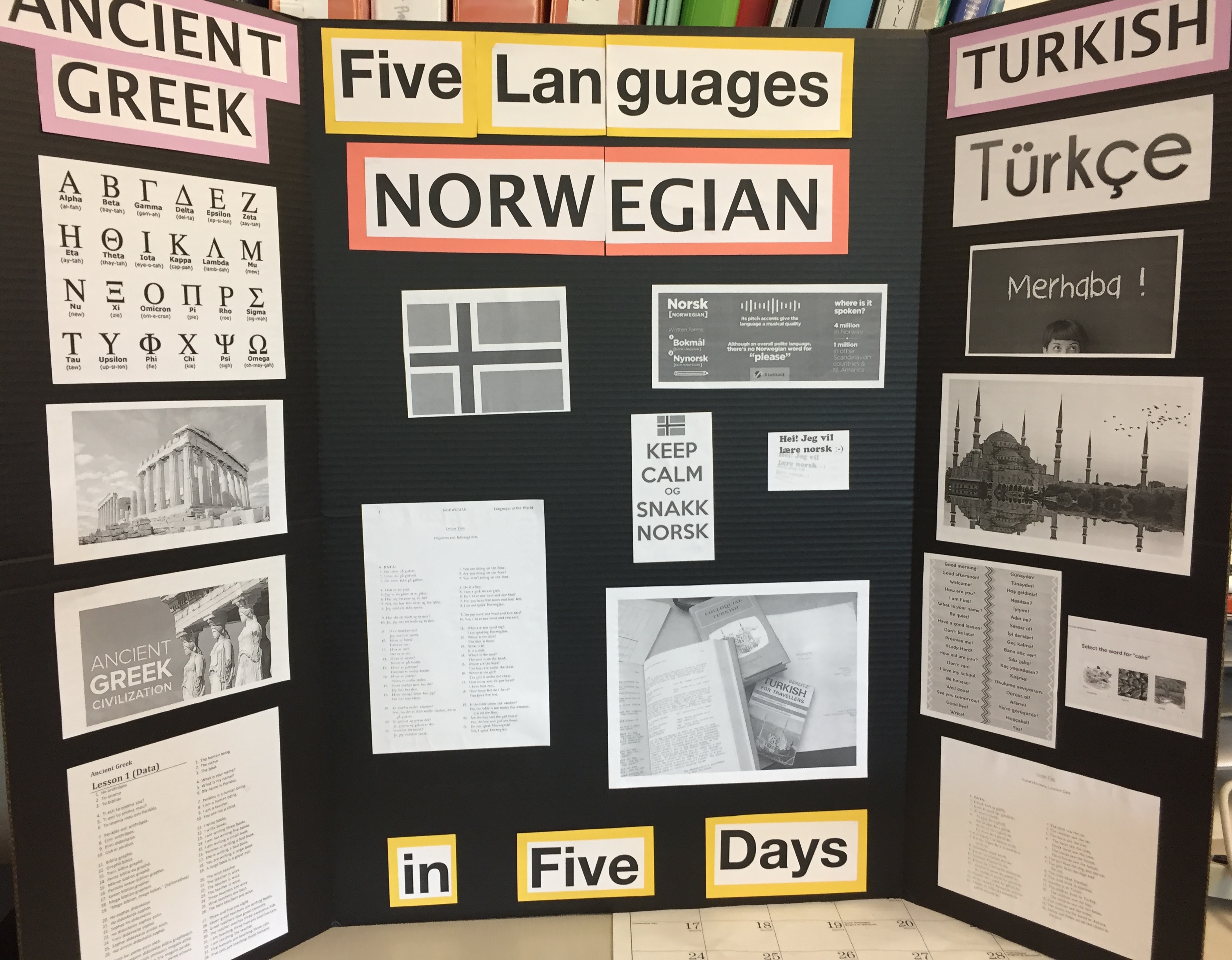 Anyway, we successfully completed the course a few hours ago, having explored Norwegian, Esperanto, Turkish, Ancient Greek, and a fifth language chosen by each pair of students. (The chosen languages were Basque, Italian, Kichwan, Polish, Portuguese, Quechua, Russian, Scots, and Tagalog!) In addition, we had guest appearances describing Hungarian and Korean. Quite a variety!