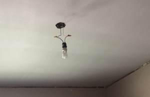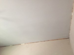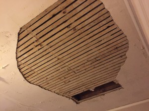 As you can see, we badly needed a new ceiling in our guest room. We also needed a ceiling light, not to mention a fan. And while we were at it, we also needed a new ceiling and new light fixture in our downstairs hall. Our “regular” contractor, who hasn’t done work for us in years, removed both ceilings, uncovering what you see above the guest room (after he put up those strips of wood) and what you see in the hall: some old wallpaper!