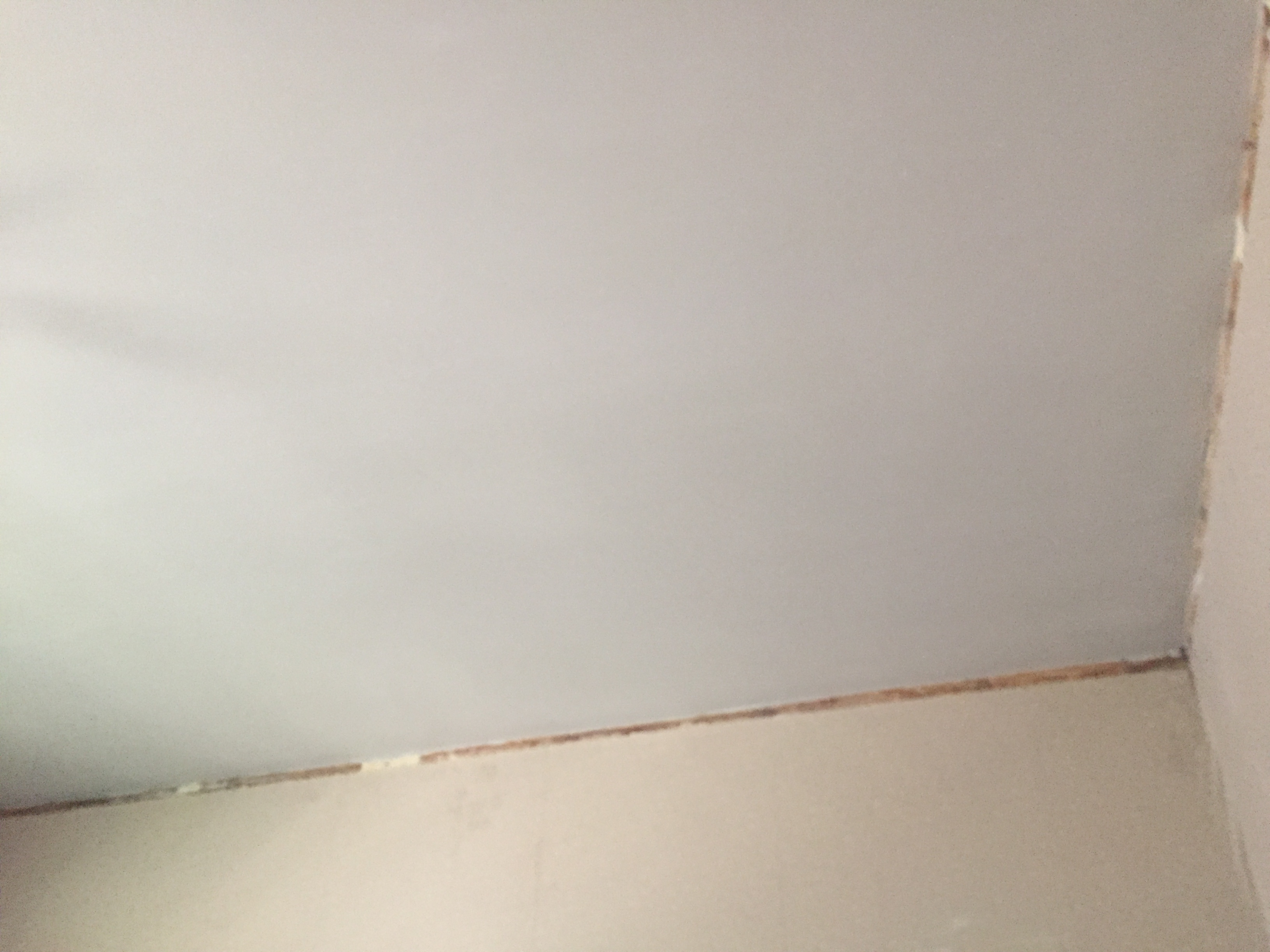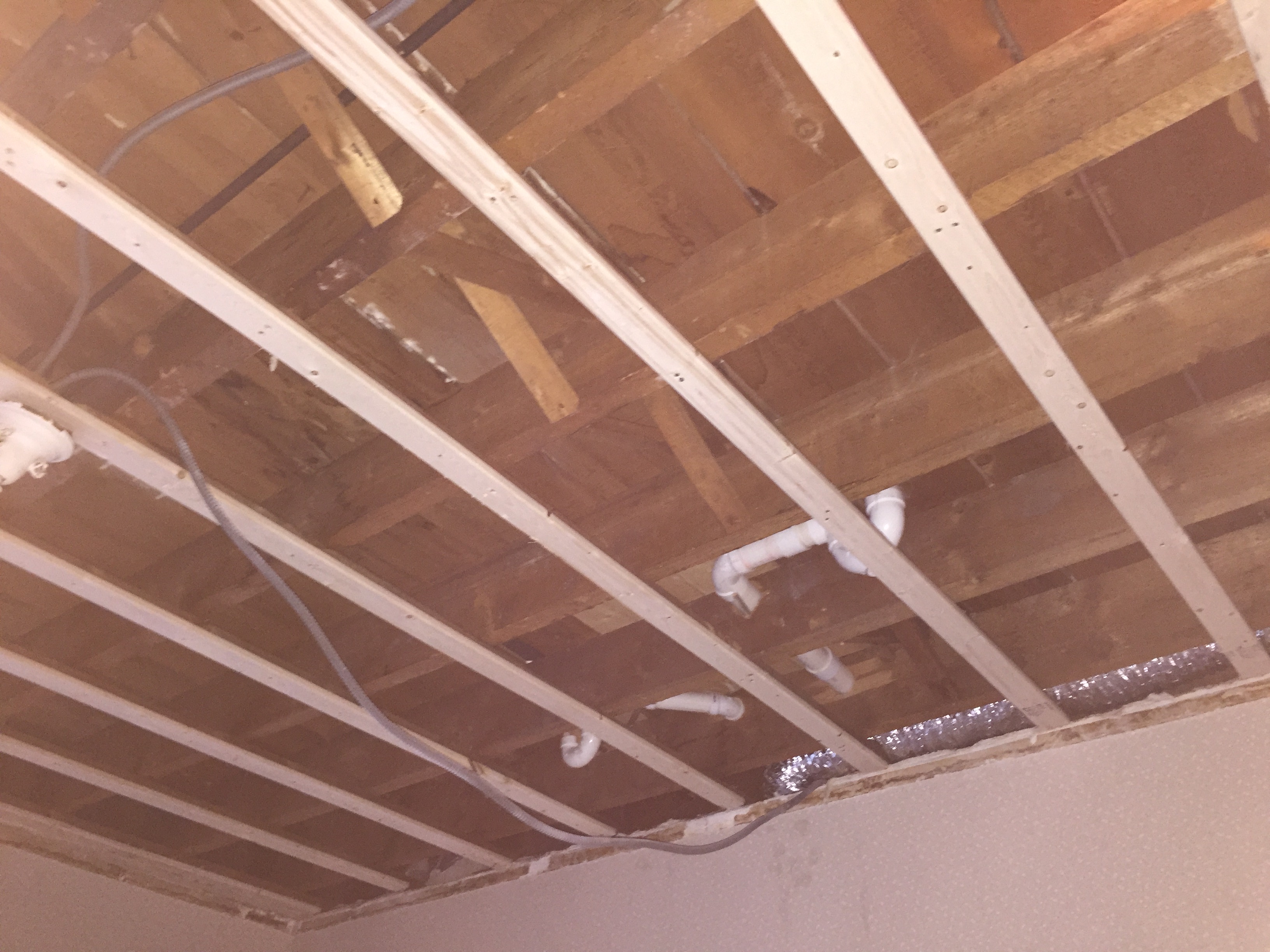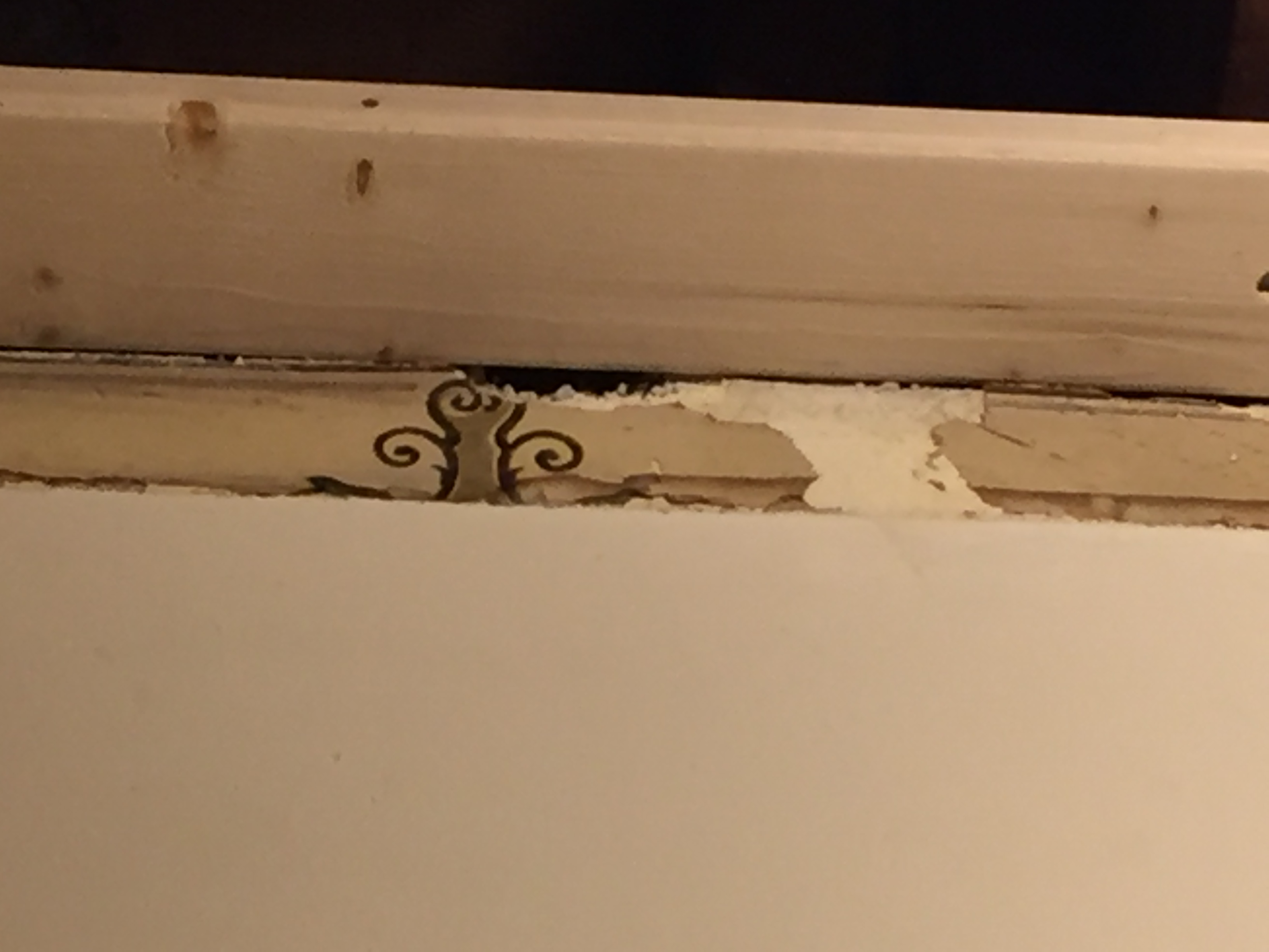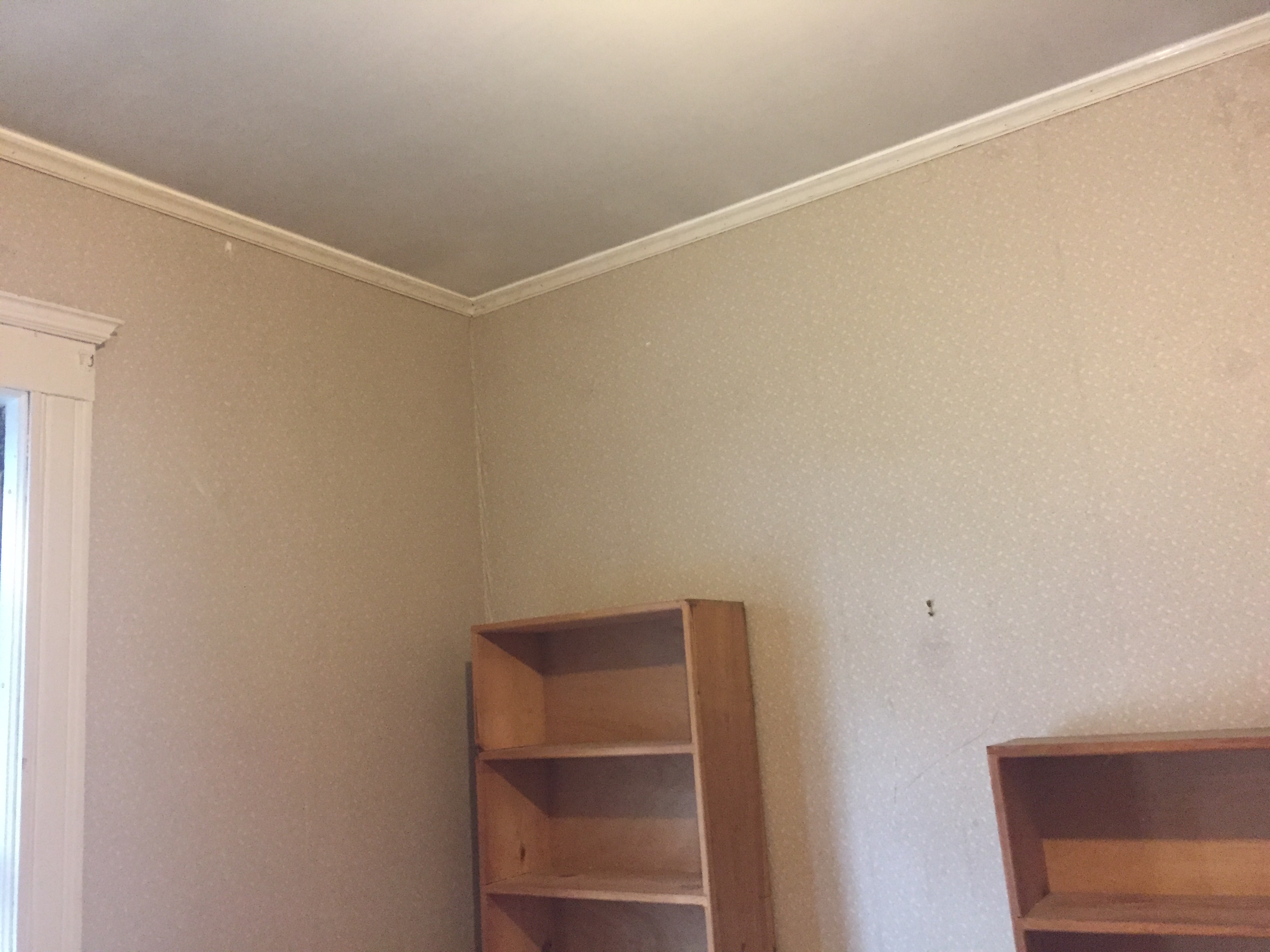 As you can see, we badly needed a new ceiling in our guest room. We also needed a ceiling light, not to mention a fan. And while we were at it, we also needed a new ceiling and new light fixture in our downstairs hall. Our “regular” contractor, who hasn’t done work for us in years, removed both ceilings, uncovering what you see above the guest room (after he put up those strips of wood) and what you see in the hall: some old wallpaper!