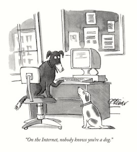 First of all, I am bothered by the complainer’s use of an anonymous forum. (This, by the way, is why I don’t allow comments on my blog, though they’re OK on Facebook, which supposedly vets its contributors.) By the time someone has reached age 17, he should know how to communicate with his teachers. If I assign too much homework, I expect my students to discuss it first with me, not with the whole world. Yes, I know that Don has apparently learned to tweet his grievances to the whole world (and we know who models that), but that should be the last step, not the first. The famous New Yorker cartoon on the right — first published in 1993, when almost nobody knew anything about the Internet — reminds us that anonymity promotes not only access but also irresponsibility. Take responsibility for your own words and your own actions! Surely any senior at Weston can find an adult to confide in without having to remain anonymous.