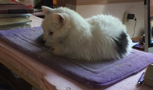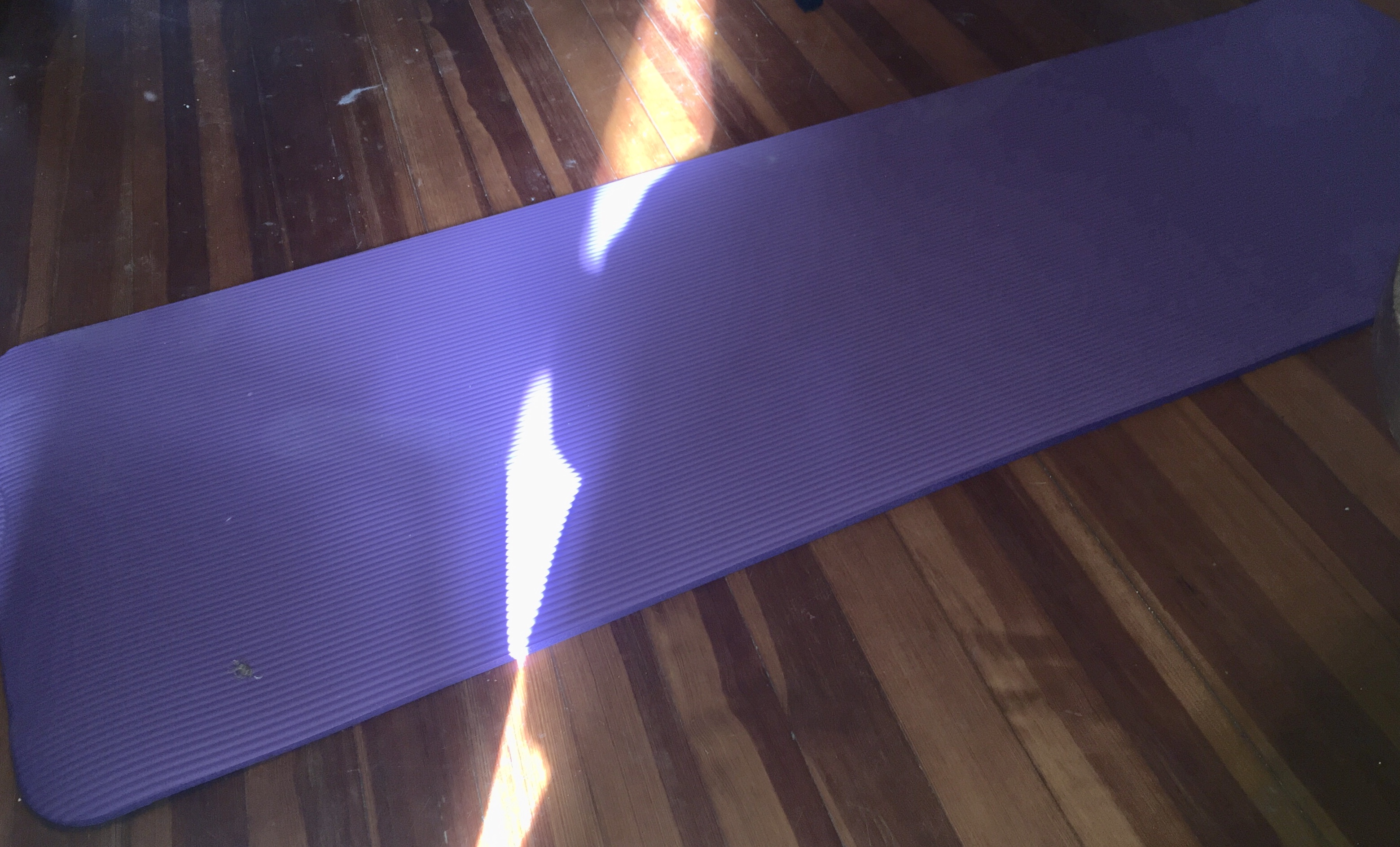 Douglas and I now have matching purple exercise mats — matching purple, that is, even if they have very different dimensions. Douglas, of course, thinks that his is a sleeping mat, not an exercise mat.