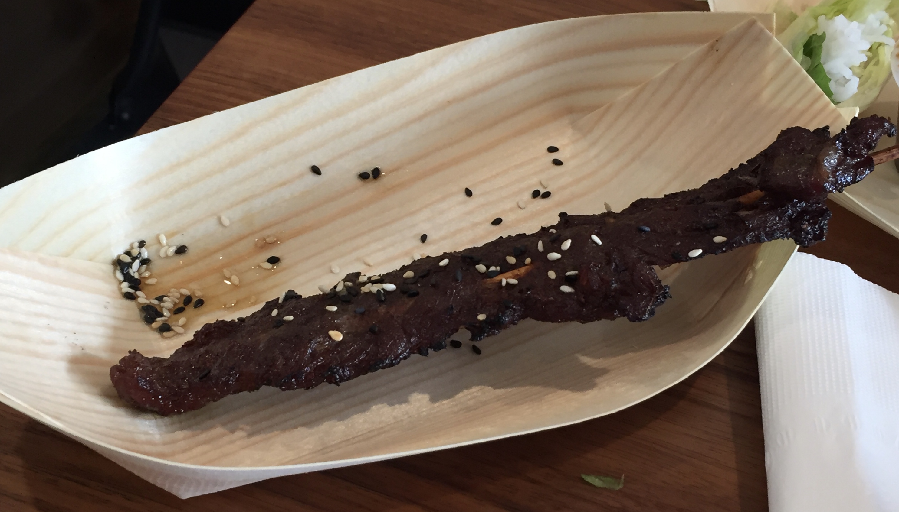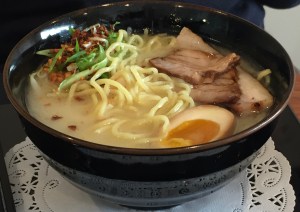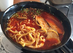 A second excellent Asian lunch in one week! Continuing Tuesday’s theme, today Barbara and I went to our local Neponset Cafe for the first time. Everything turned out to be scrumptious. We started by sharing shrimp fresh rolls and beef teriyaki skewers, followed by ramen for each of us: non-spicy ibusuki ramen for Barbara and spicy sakurajima ramen for me. Mine, at least, was astonishingly good — possibly the best ramen I’ve ever had, with perfect textures and just the right balance of flavors. Look at the photos below, and see whether you can tell which ramen is which. Shouldn’t be too hard.
