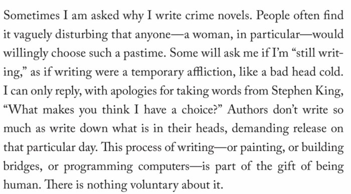 Although Malliet’s work is on the conventional side, there are a couple of things about it that are not particularly conventional for a British cozy. One is that her protagonist is neither a professional detective (like Hercule Poirot) nor a little old lady (like Miss Marple); he’s a former MI 5 agent who has become an Anglican priest. Of course being an MI 5 agent is somewhat related to being a detective, and the village of Nether Monkslip has some similarities to St. Mary Mead, so there are still connections here. The other unconventional aspect of this series is that Malliet is actually American, like Elizabeth George, even though she seems convincingly English, at least to my American ears. But what do I know?