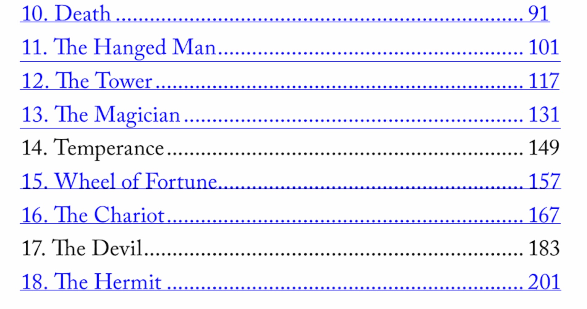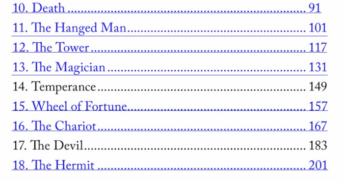 One other point: Tarot cards figure prominently at several points in In Prior’s Wood, and I can’t quite figure out why. I am handicapped by knowing next to nothing about Tarot, and I feel uncomfortable around those who profess a belief in it. But I noticed early on in reading this book that the chapter titles are clearly names of Tarot cards. For example, chapters 10–18: