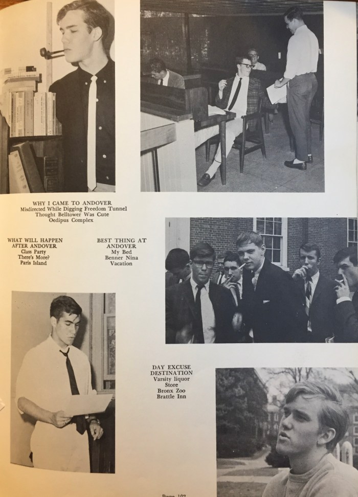 In case it isn’t clear, I’m talking about Phillips Academy (PA) — that’s the one in Andover, MA, not to be confused with Phillips Exeter Academy (in Exeter, NH), nor with Andover High School (in Andover, MA). Back in the ’60s, when I attended PA, it was still a very traditional New England prep school and therefore all male. As I’ve said elsewhere, my experience there was academically first-rate but socially and culturally horrible. You can infer a lot about the culture with a careful look at a single page from my yearbook: