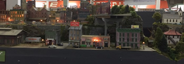 I suppose it would be Amhersteisenbahngesellschafteisenbahnhobbyausstellung if you spoke German, but fortunately we don’t have to do that. What we did have to do was go to West Springfield, not Amherst, since this annual show had outgrown all available facilities in Amherst many years ago. Now it occupies four entire buildings at the Eastern States Exposition “The Big E”, and there’s no way I would have the stamina to see everything. This year I focused primarily on urban layouts, to match what I am building on my own railroad. (Last month, when I explained my project to a friend and colleague of mine who asked me to do so, she listened carefully and then responded by saying that it was basically like building a dollhouse. “No, it’s not at all like a dollhouse,” I replied defensively….)