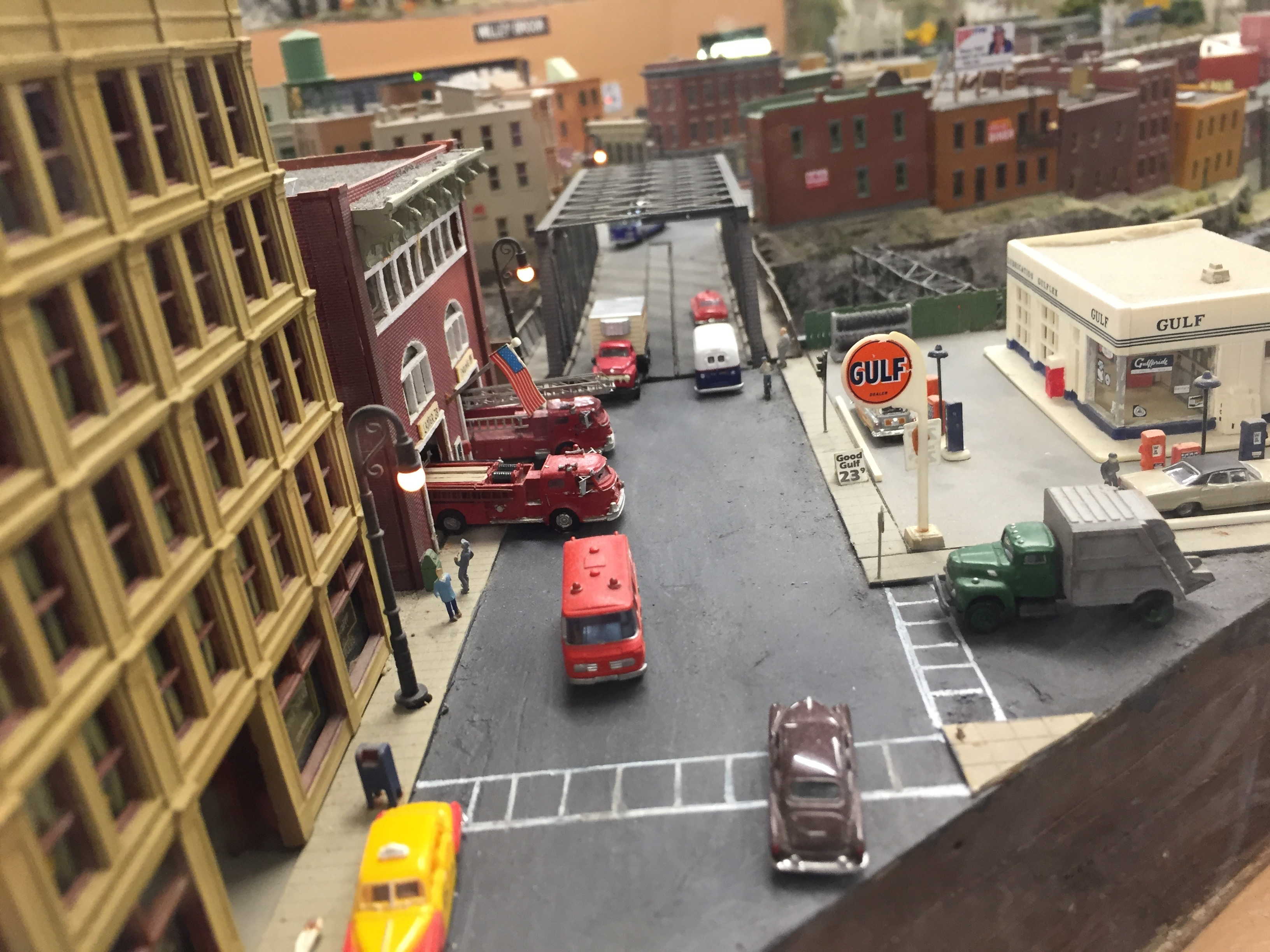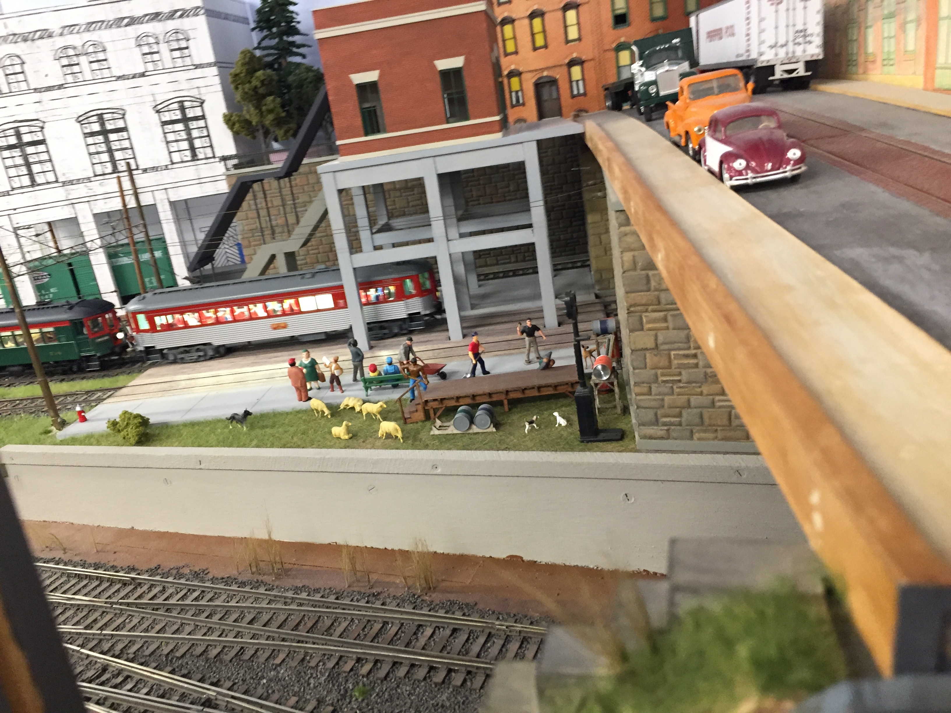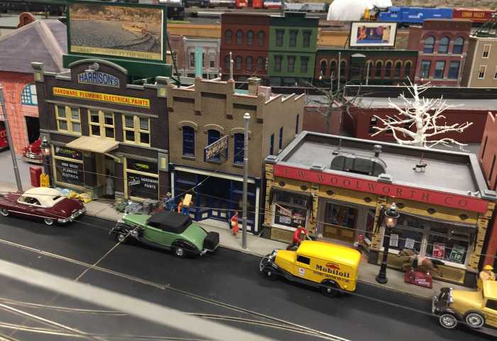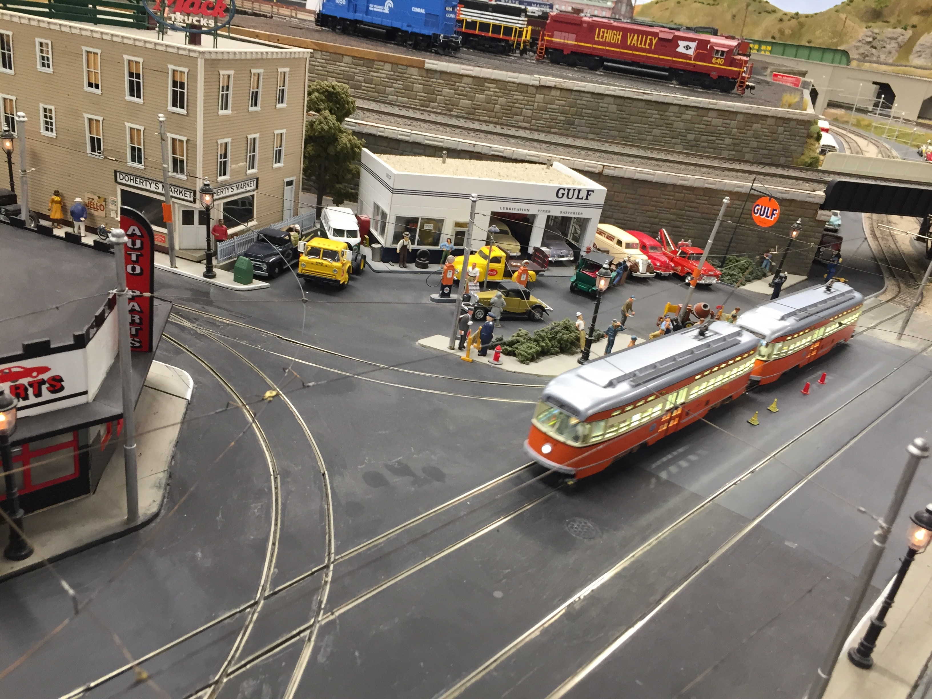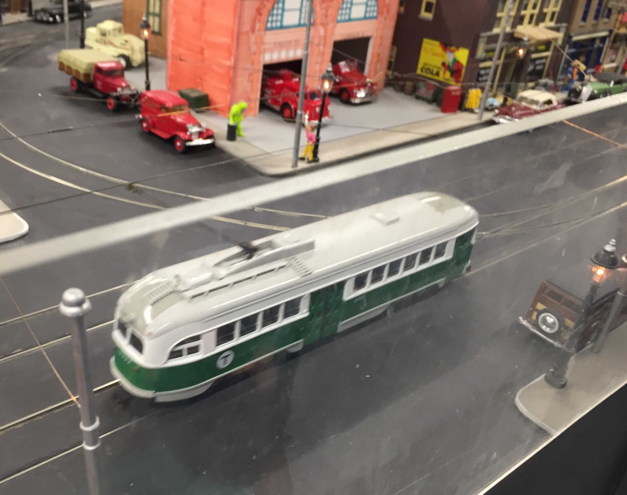 Cool O-gauge trolleys capturing old-time Roslindale Square.