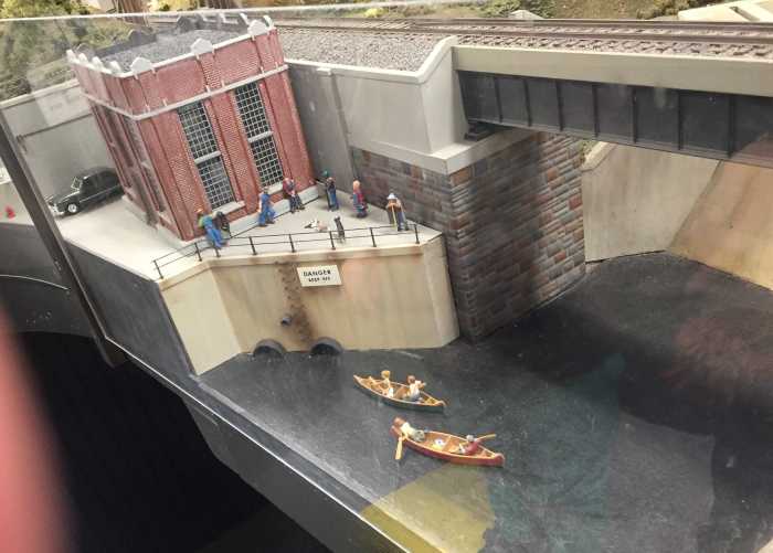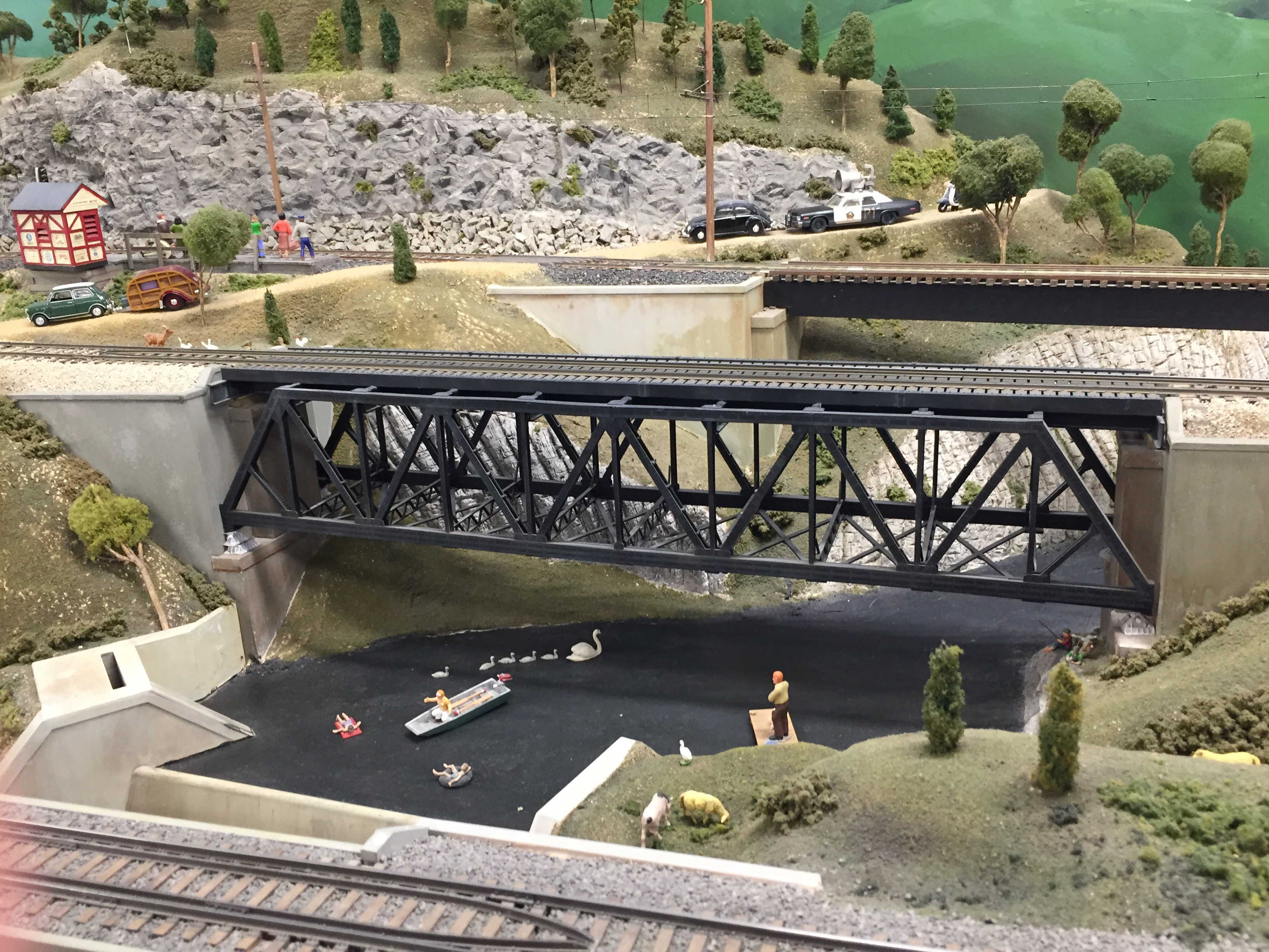 Swimming, boating, swans, and a man on a dock make up just part of this scene, which also features more animals, a dam, rocks, a tree-covered hill — and tracks, of course.