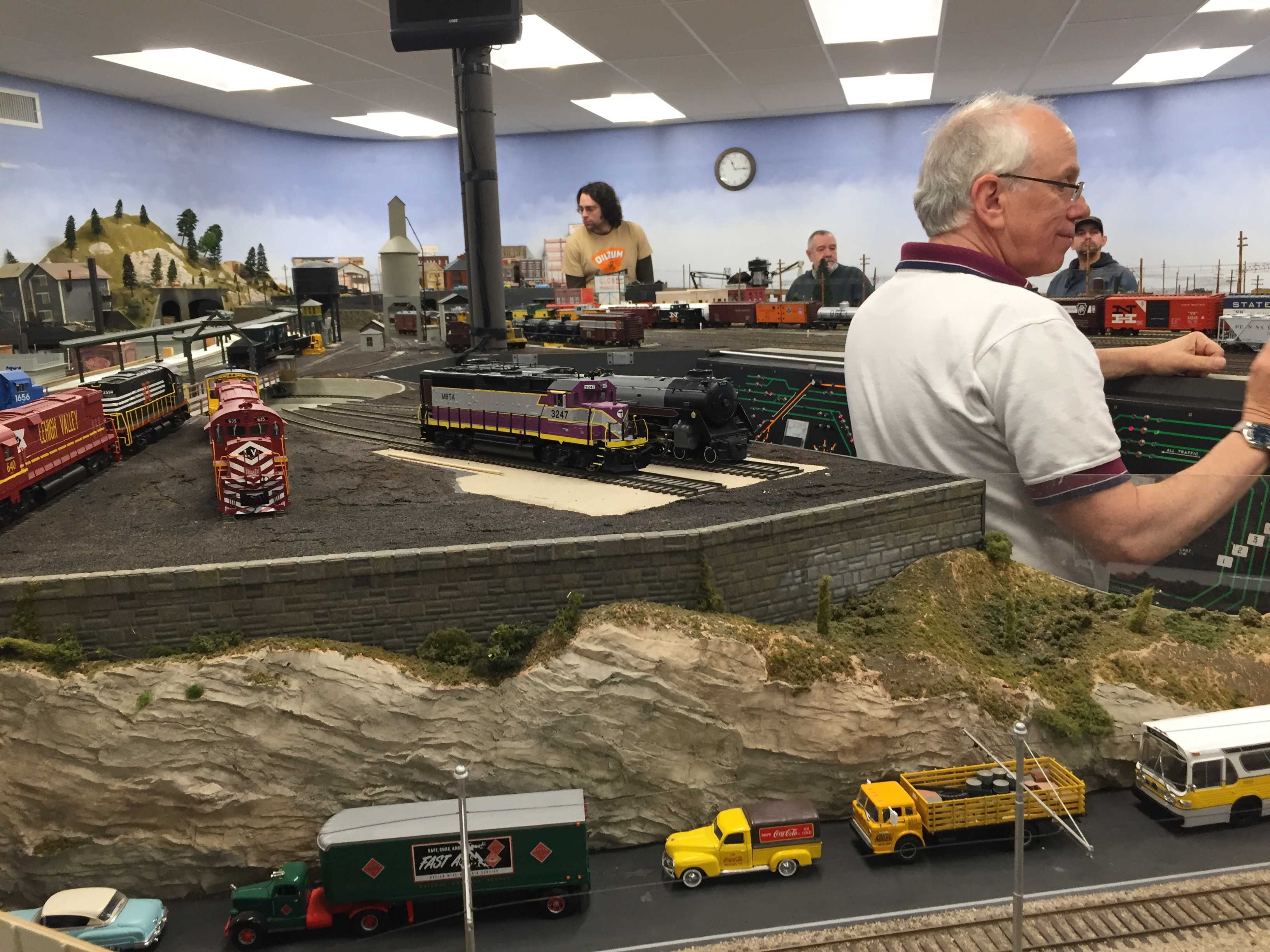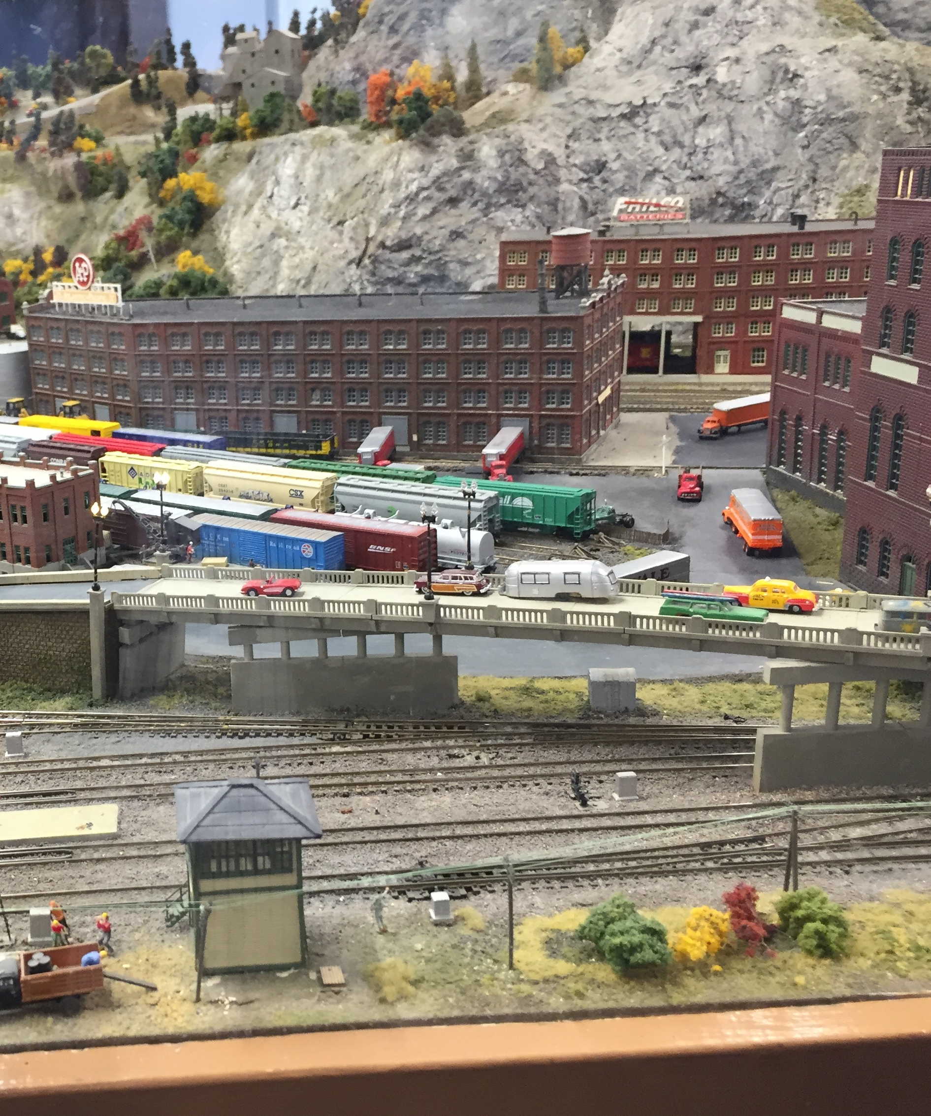 OK, enough fooling around with German. Let’s get back to the show itself, which was even better than its title. Twice a year — in December and March — the Bay State Model Railroad Museum hosts a two-day open house at their Roslindale location. (The rest of the year the museum serves as the clubhouse for the world’s nerdiest group of model railroaders: they are model railroad engineers, after all.) The museum houses four layouts, one each in N, HOn3, HO, and O scales. Despite the ostensible emphasis on engineering, all four layouts also function as carefully designed dioramas, with wonderfully detailed scenery and structures. Here are some photos from this spring’s show, which I attended on Sunday: