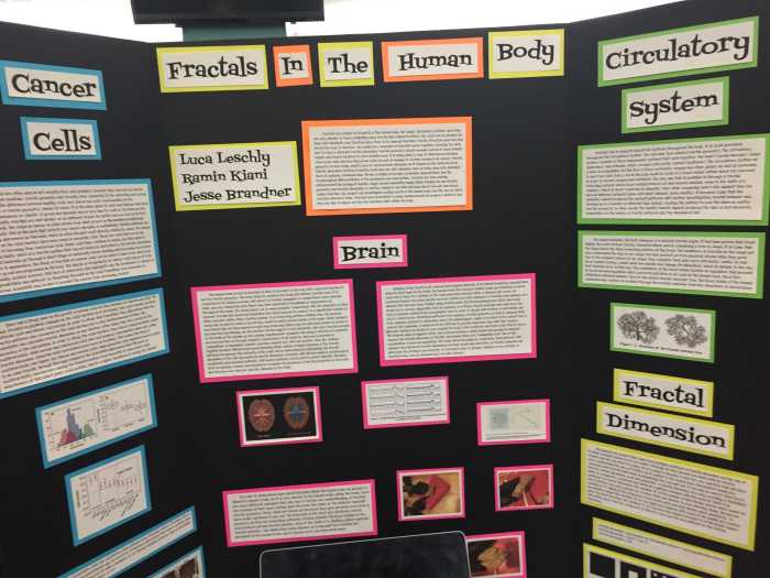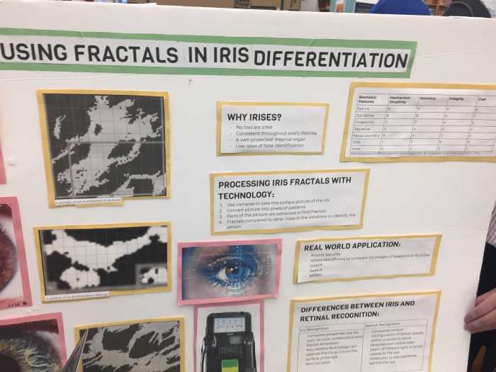 I returned to Weston yesterday for its 17th annual Fractal Fair. That’s a lot of fractal fairs! As you might expect for a subject that keeps evolving every year, with an entirely new set of exhibitors every year, the fair is always changing even if the basic precalculus curriculum has stayed largely the same. This year’s contributions were excellent, as usual, with a wide variety of topics, especially including a large number related to the human body, such as cancer, detection of heart disease, and airport security by iris identification (the eye, not the flower). I particularly enjoyed two different projects on fractals and music: