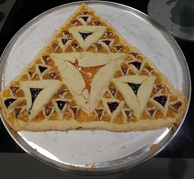 I’ve been more and more inspired by math lately (details in a moment). I learned some basic facts about the Sierpinski triangle as i went. First of all, when rotated to any side, it looks the same; I couldn’t even tell where I’d started it. Also, as the triangles get smaller, notice a pattern in the quantity of each size: 1, 3, 9, 27…. I’m sure it would go on if I could make really really tiny hamantaschen, but I don’t have that much power. Also, technically this triangle has no area, so maybe all the sugar doesn’t count? But careful with that logic: it has infinite perimeter, and that dough for the perimeter is full of not-healthy ingredients like flour and sugar and oil.
