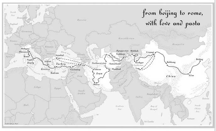 OTNR is based pretty directly on the Silk Road. Newly married food writer Jen Lin-Liu, an ABC whose family hails from Taiwan, decides to trace the path of the original Silk Road from east to west in order to follow the route originally taken by noodles. The result is part travelogue, part culinary history. As you can gather from the map, most of the territory she passes through is dominated by Muslims, a recurrent theme throughout the memoir. If you think you’re going to find no pork and no alcohol, think again. Lin-Liu travels through Kyrgyzstan, Uzbekistan, Turkmenistan, Iran… all of which may make you, the reader, a bit nervous. You’ll learn more about social mores and the roles of women than you will about noodles, but that’s fine. You’ll feel at home in Italy and you’ll learn why Italians don’t get fat after eating their four-hour meals that always contain pasta or rice.