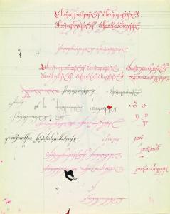 There’s nothing like looking at the actual artifacts to get a sense of the reality of the subject of any exhibit. Those who know me will not be surprised to hear that I was particularly taken by the maps and the linguistic information, even though I badly wanted more of both. (Quite a few books on Tolkien have been published, but apparently no one has written a book that focuses entirely on his maps and languages. Barbara suggests that I should write one.) The maps demonstrate clearly why anyone drawing a map should do it on graph paper, as Tolkien was fanatical about making sure that his distances and travel times in Middle Earth were all consistent.