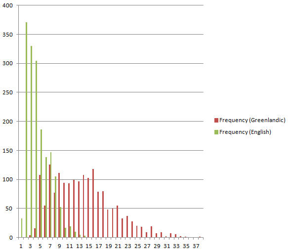 Anyway, I promised you a “compellingly informative bar chart,” and here’s one from the article, which points out that it shows “Quite a striking difference” between English and Greenlandic. The horizontal axis is word-length, the vertical is number of words of that length (from comparable texts):