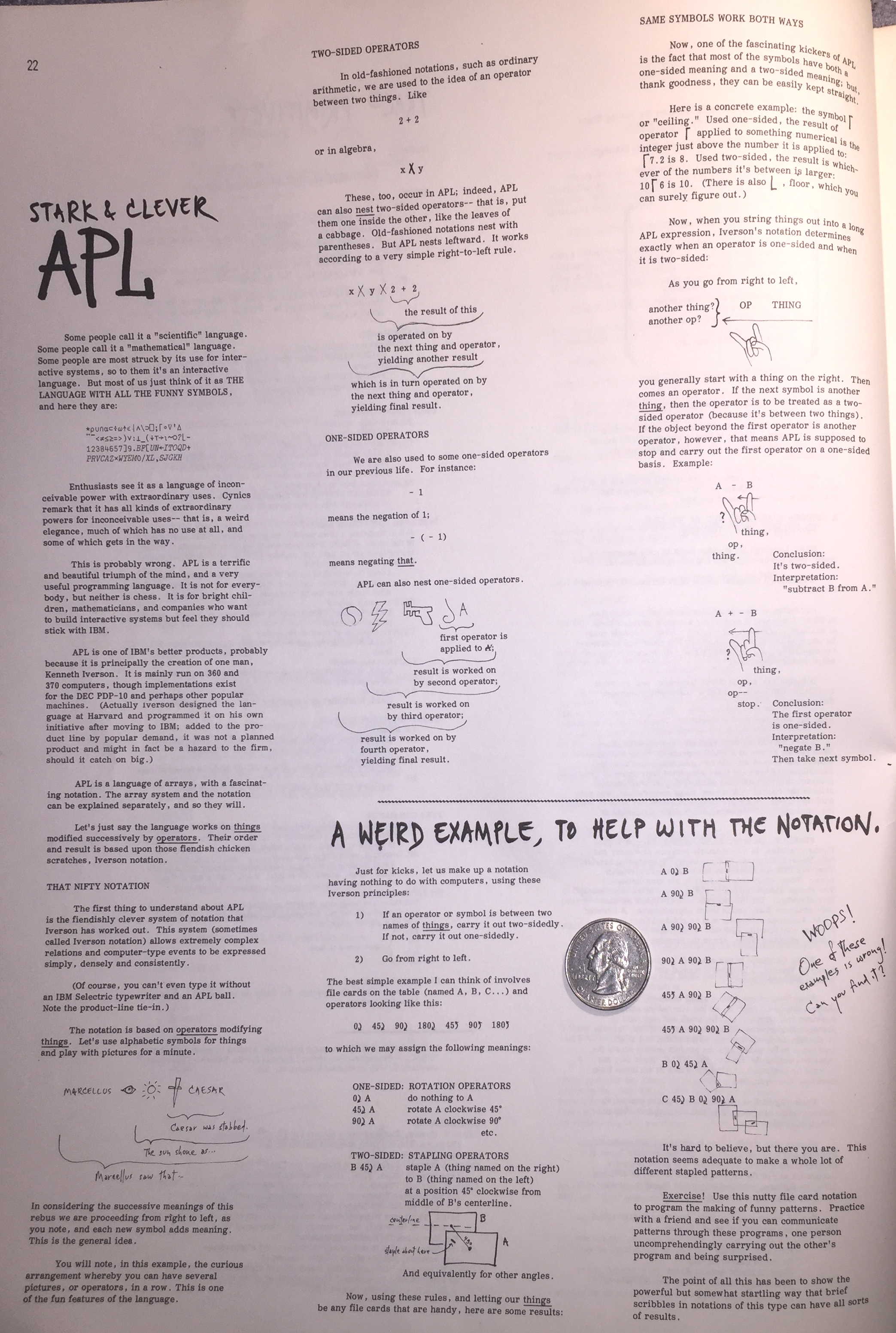 Notice the tiny type (hard to read for eyes that are older than 30), handwritten annotations, and general clutter. But I also need to comment on the topic of this page: APL is one of the very few programming languages discussed in Nelson’s book, and it happens to be one that I not only learned but also taught. One year at Lincoln-Sudbury, when I was teaching Algebra II Honors along with my friends Alison Birch and Phil Lewis, we decided to incorporate APL into the course. (I’m always seeking to incorporate programming into my math classes, usually with less success than I had hoped.) We chose this because APL is a programming language with a strongly algebraic bent, including the ability to work with vectors and iteration in very simple ways. Unfortunately the strange symbols made it too daunting for too many students.