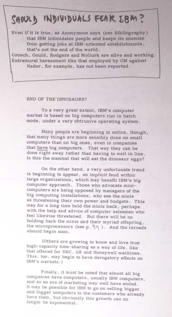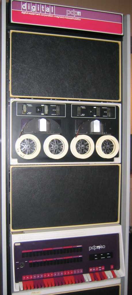 But I know — from teaching this stuff to my students — that you probably have a completely wrong idea of what Nelson means when he writes about “small computers” or “mini-computers” or “minis” for short. Unless you were working with computers 45 years ago (and very few of my readers were), you’re probably thinking of today’s desktop PCs or Macs, or maybe even laptops. But no: he means computers like DEC’s PDP-11, shown here. Of course you have no scale, no point of comparison, so let me just say that this machine was taller than a person (taller than I, at any rate) and was “mini” only by comparison with the room-sized IBMs that were common at the time. I’ll let you figure out how we possibly communicated with this beast, since you see no keyboard and no monitor. As a brief aside, let me remark that it’s not that keyboards and monitors were unknown in the day. In fact, even back in the previous decade, the ’60s, Harvard owned a PDP-1 mini-computer, which took up a good chunk of a carefully temperature-controlled room and came with keyboard and monitor. This time you can judge the scale by human comparison.