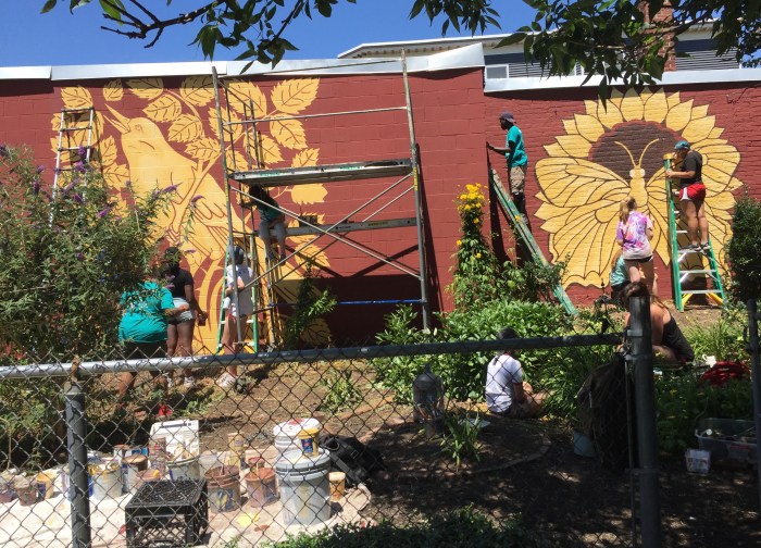 A group of dedicated high-school students and city employees paint a mural, in historically accurate colors, overlooking the garden maintained by community volunteers at Clementine Park in Dorchester: