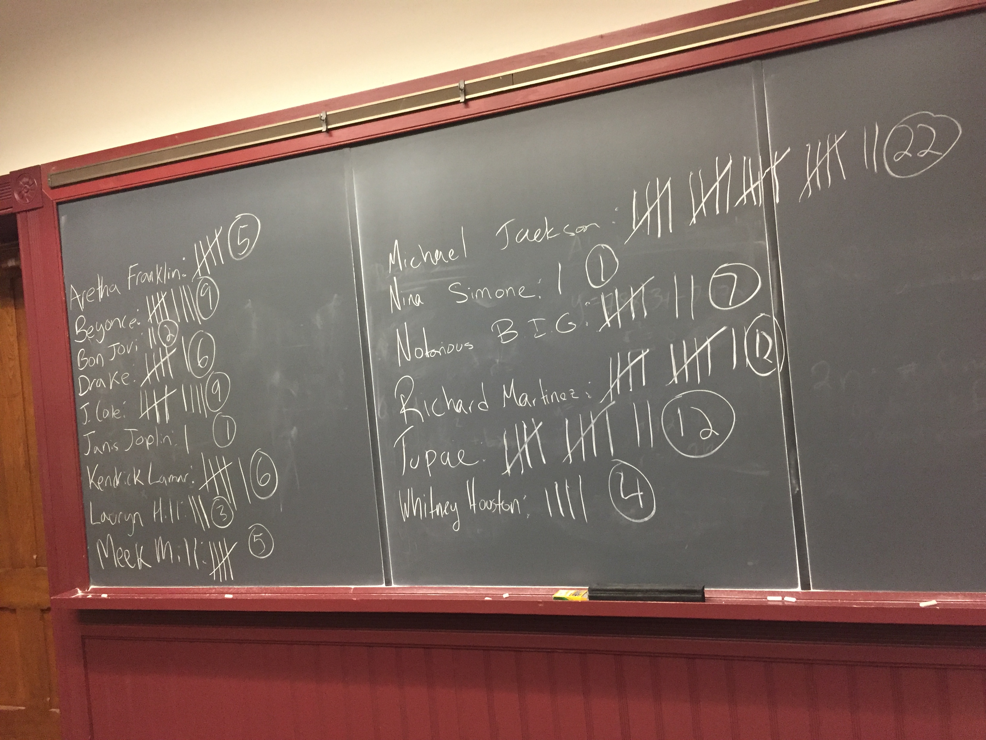 Keep in mind that these are inner-city sophomores from public high schools in Boston and Cambridge. So it may be expected that Michael Jackson would come in first, as he almost always does. And Tupac isn’t surprising (but see this article). I might not have expected Aretha Franklin. And I certainly wouldn’t have expected Bon Jovi or Nina Simone. And Janis Joplin???? In 2019 teenagers? That’s a surprise.