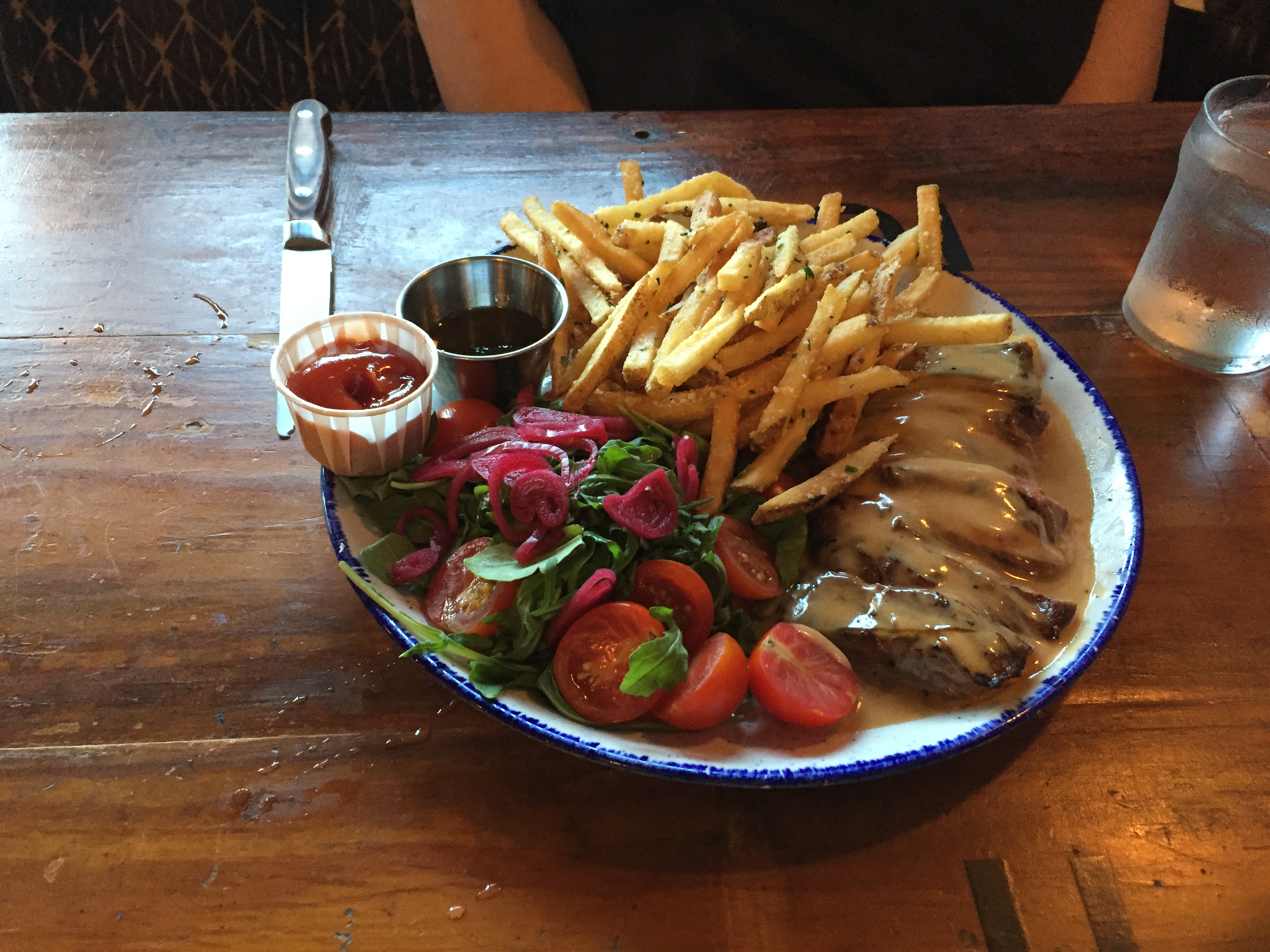 But of course what you really want to know is how the food and the service were. Barbara had steak tips with herbed parmesan french fries and arugula+tomato salad, as you can tell from the photo. She reports that all was really good, with the steak coming rare as ordered — though the sauce and the salad were not totally to her taste (sauce was a bit “too beefy” and she’s not fond of arugula).