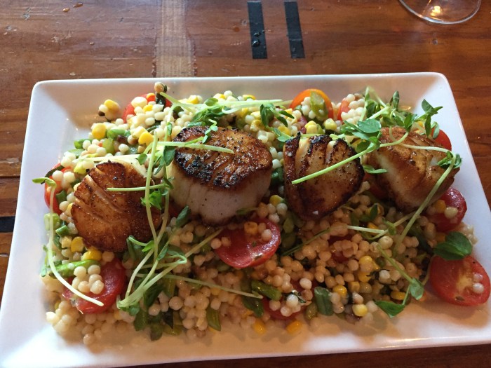I ordered these four huge sea scallops, perfectly grilled, with an enormous amount of “summer succotash”: Israeli couscous, corn, cherry tomatoes, asparagus, and watercress. Don’t they look beautiful? And delicious!