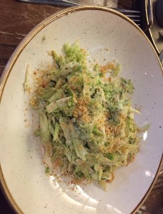 - an unusual Caesar salad made with celery and shaved asparagus instead of romaine lettuce (but still with parmesan and croutons) —it was good, but a little too heavy on the celery leaves