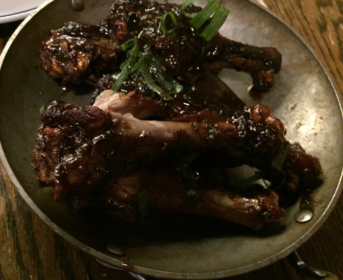 - gloriously sticky crispy confit duck wings in Jamaican jerk sauce, which required the accompaniment of a finger bowl containing warm water and lemon, along with two wet naps
