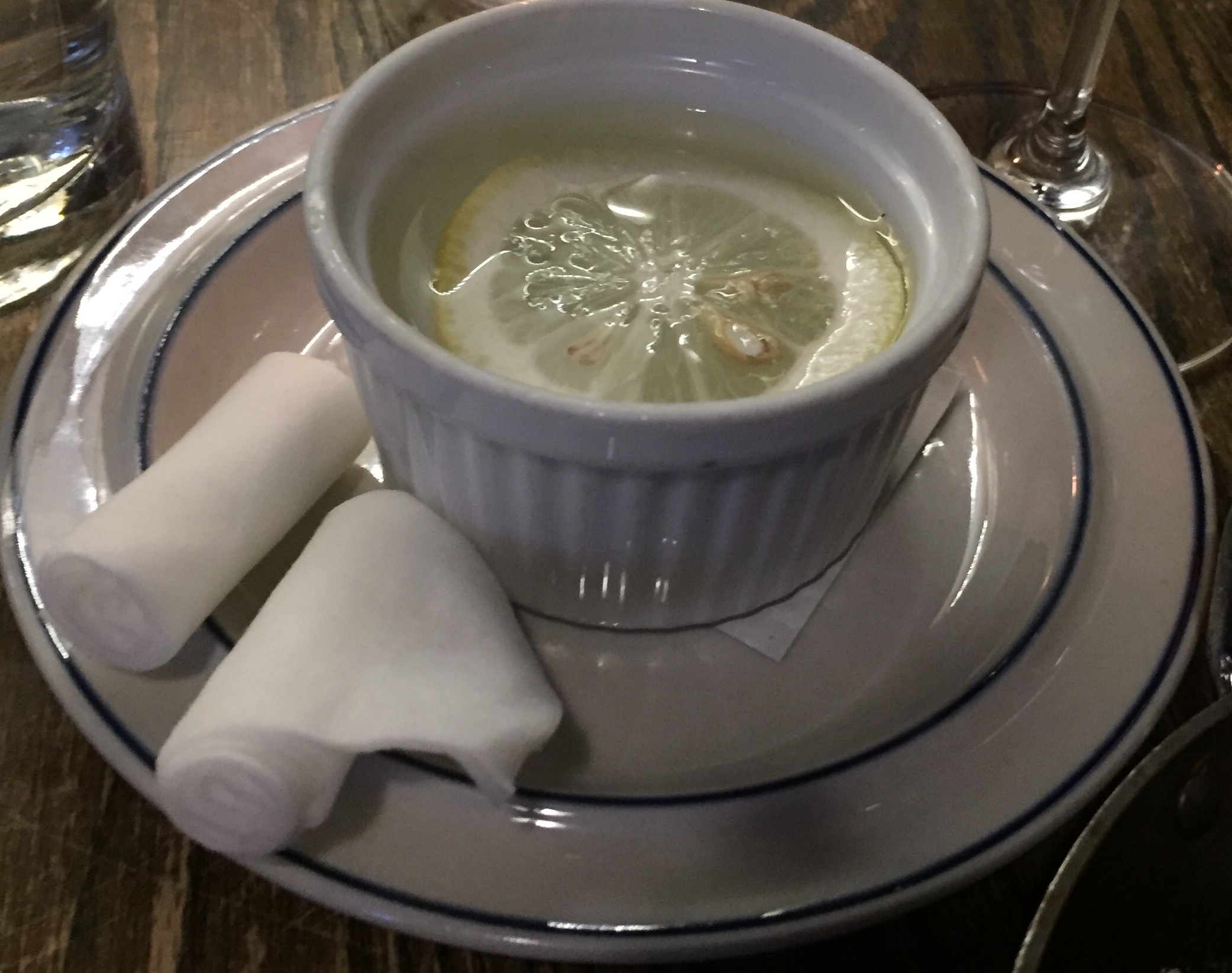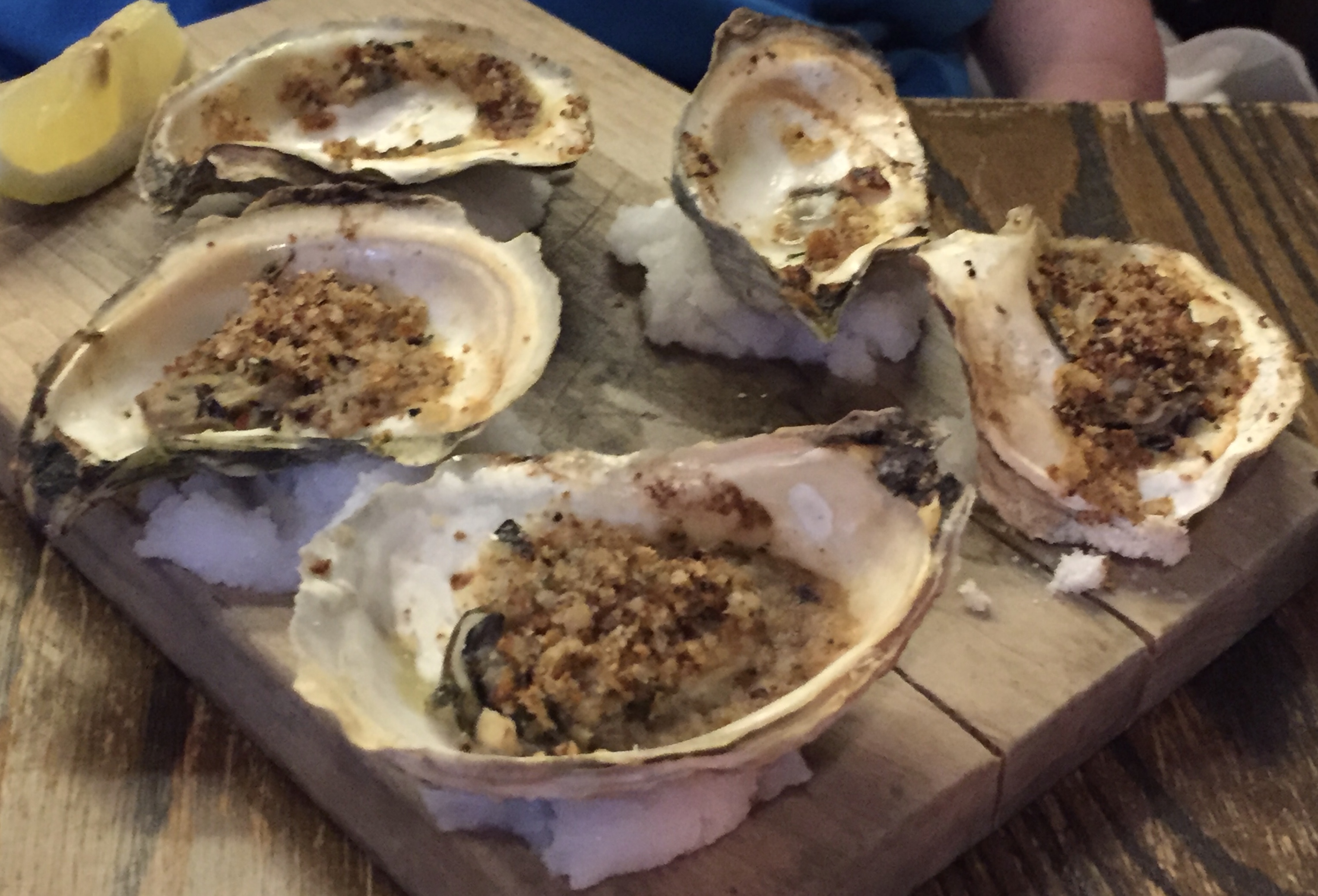 Barbara started with five so-called “coal-roasted oysters,” served with scampi butter, lemon, and bread crumbs. She reports that those too were delicious, even if not as artistic as the tuna. I had to take her word for the deliciosity, as I don’t like oysters. She had already consumed two of them by time I remembered to take a picture: