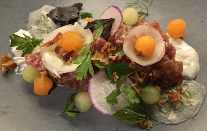 I started with this lovely yellowfin tuna tartare. The description doesn’t really do it justice (“cucumber, melon, chili vinaigrette”), but I hope the photo does. Note the pancetta, the paper-thin radish slices, the parsley. Obviously assembled by an artist — and delicious to boot!