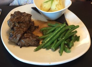 Anyway, we had a good meal. Food, service, and ambiance were all fine. Walking the one block from the parking garage to the restaurant, we couldn’t help noticing that the sidewalk was oddly flooded. Oh wait! That was a decorative fountain! A nice touch, actually. (See photo.) Barbara had steak tips, cooked medium rare as ordered, along with mashed potatoes and green beans — amazingly not overcooked! (See photo.) I ordered an excellent ribeye steak, grilled rare as ordered, with far too many onion strings and nicely roasted Brussels sprouts — again amazingly not overcooked. (See photo.) At the last moment I decided to order French onion soup (forgetting that I was going to have onion strings!) as my starter. It was properly prepared and very hot, but both sets of onions were a little too sweet for my taste (Vidalias, maybe?); that may just be my problem. Service was attentive without being overbearing.