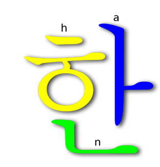 But from the point of view of a naive reader, albeit one with a relevant background in linguistics, I’ll comment a bit about the Korean book, shown in the image above. The first point is that until three years ago I thought Korean used a character-based system, like Chinese, as there are far too many glyphs that we can see on the menus of Korean restaurants for it to be an alphabet. My error was a common one. For instance, a glyph like 한 appears to be a single character, hiding the fact that it’s actually three consecutive alphabetic letters, artfully arranged in a square box; Wikipedia decomposes it like this, where the colors and the labels show the three letters hidden in the glyph: