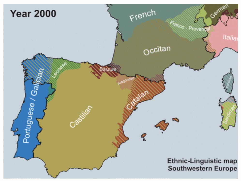 I am guessing that most of my readers will scan through this list, will recognize that seven of these are Romance languages (#1, 2, 3, 4, 8, 12, 13), and will therefore guess correctly that the other six must also be Romance languages, even without being able to identify what specific languages they are. Of those six, if you don’t know that Corsican (#10) and Sardinian (#11) are actual languages, you will still probably assume from their names that they are spoken primarily on the islands of Corsica and Sardinia respectively, as they are. (Yes, the official languages in those places are now French and Italian, for imperialist reasons.) The two differ substantially in number of speakers: Corsican is currently spoken by only 125,000 people, Sardinian by about 1.4 million. The latter figure would be a surprise to most Americans, who tend to be more insular than those on the island of Sardinia.
