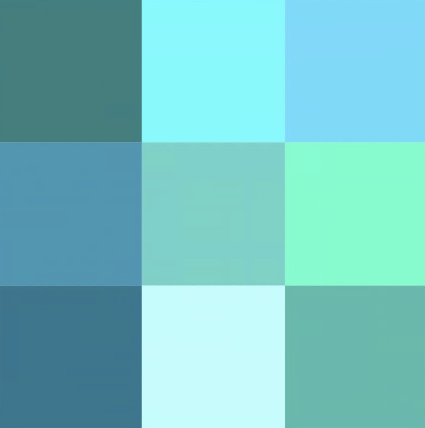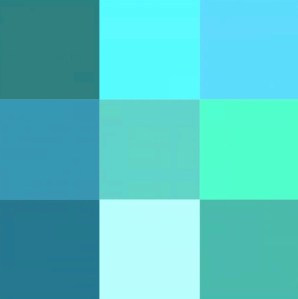 Take a look at the color chips in the image. If we limit ourselves to common English color names (excluding, that is, the myriad of names used by both types of painters and the like), I suppose we might call all nine colors shades of green. Or maybe blue. Or both. I have no idea!
