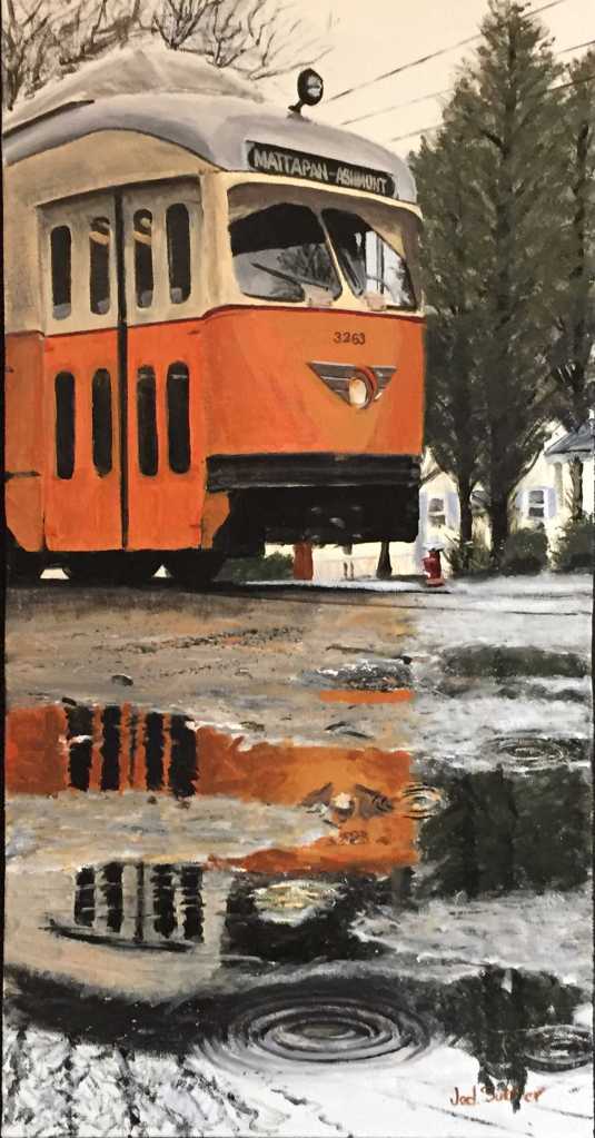 Reflections is probably my favorite. I love the representation of the reflection, of course (and not just because it’s a geometric concept), but it’s mostly the Mattapan-Ashmont trolley that does it for me. As you know, I’ve been fascinated by trains, transit, and trolleys for most of my life, and I’ve lived in Dorchester for 34 years now, fairly near the Ashmont-Mattapan High-Speed Line, as this trolley line was called until last year. (Now it’s officially just the “Mattapan trolley.”) It’s not clear what’s especially “high speed” about this line, but it’s a still-functioning symbol of the past and it’s apparently the only public transit line in the country that goes through a cemetery. So, for all these reasons, this painting of Sutter’s speaks to me. Note the old PCC car.