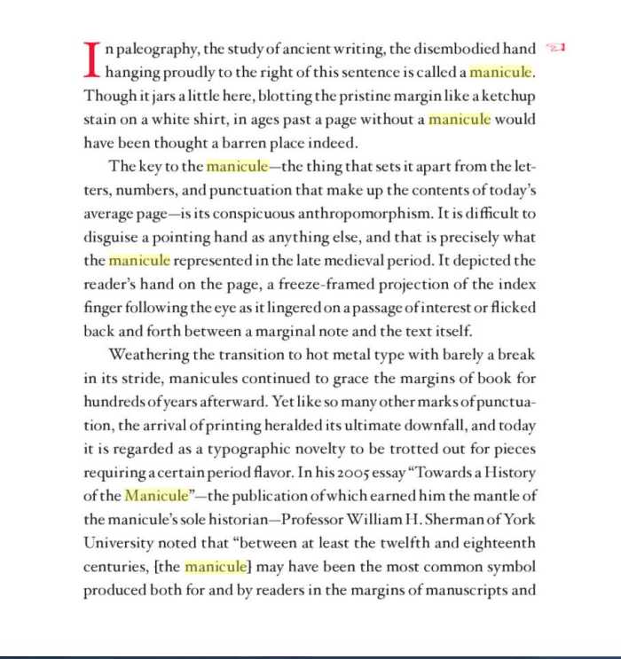 Keith Houston (who is not a professional typographer) has written a surprisingly lively book with the title Shady Characters: The Secret Life of Punctuation, Symbols & Other Typographical Marks. You can think of it as a history of punctuation, but it’s actually much more than that. Here is an example, a page about the manicule (the character you see here that looks just like a pointing hands but is actually a pseudo-punctuation mark). Read it slowly and savor the language: