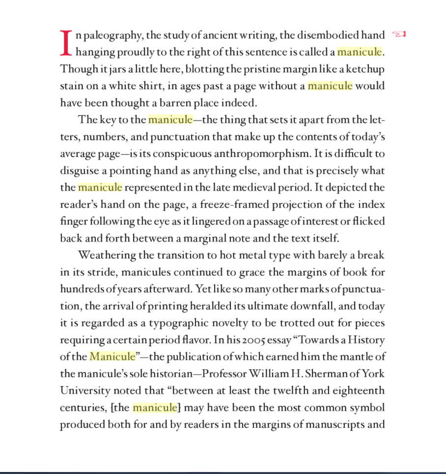 Keith Houston (who is not a professional typographer) has written a surprisingly lively book with the title Shady Characters: The Secret Life of Punctuation, Symbols & Other Typographical Marks. You can think of it as a history of punctuation, but it’s actually much more than that. Here is an example, a page about the manicule (the character you see here that looks just like a pointing hands but is actually a pseudo-punctuation mark). Read it slowly and savor the language: